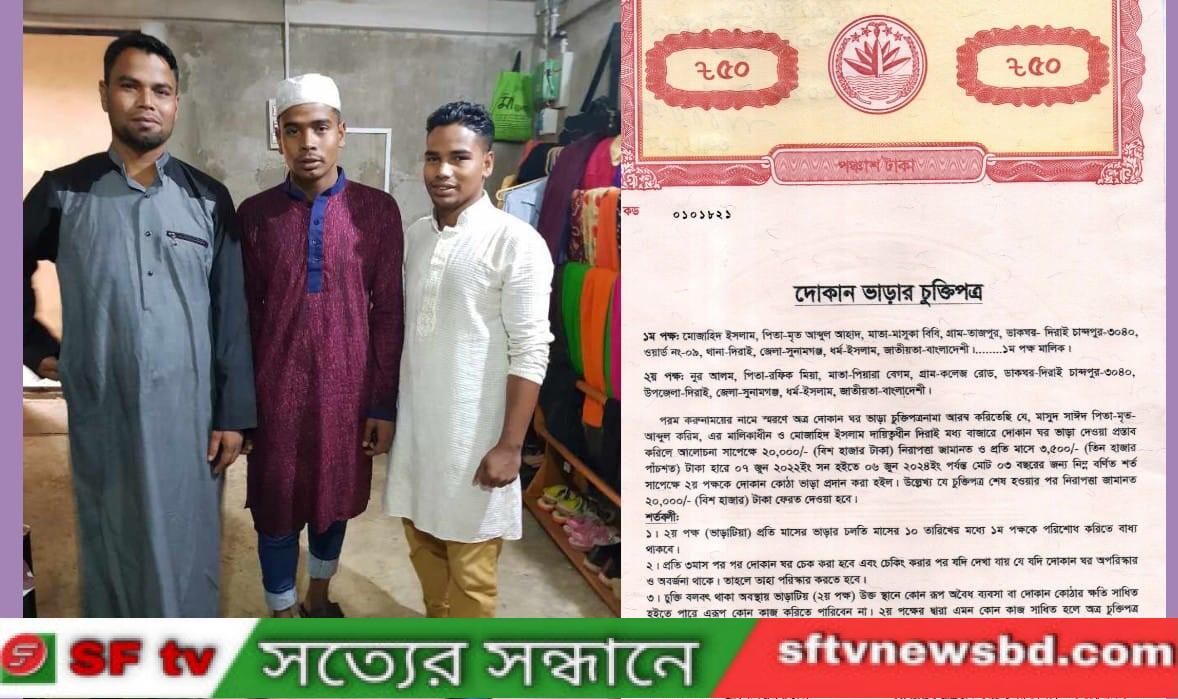 মোজাহিদ ইসলাম চুক্তিনামায় রফিক মিয়ার পুত্র নুর আলম কাছে দিরাই মধ্য বাজারে দোকান কোঠা ভাড়া দেওয়ার প্রস্তাব করিলে আলোচনা সাপেক্ষে ২০ হাজার টাকা নিরাপত্তা জামানত ও প্রতি মাসে ৩,৫০০ টাকা হারে ৭ই জুন ২০২২ সাল হইতে ৬ জুন ২০২৪ ইং সাল পর্যন্ত মোট ০৩ বছরের জন্য শর্তসাপেক্ষে দোকান কোঠা ভাড়া প্রদান করা হয়।