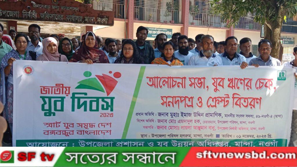 নওগাঁর মান্দা উপজেলা প্রশাসন ও মান্দা উপজেলা যুব উন্নয়ন অধিদপ্তরের আয়োজনে বুধবার (১ নভেম্বর ) ২৩ খ্রিঃ সকাল ১০ টায় উপজেলা পরিষদ হলরুমে জাতীয় যুব দিবস পালন উপলক্ষে আলোচনা সভা,যুব ঋণের চেক, সনদপত্র, সফল আত্ম কর্মীদের মাঝে সম্মাননা স্মারক বিতরণ করা হয়েছে।