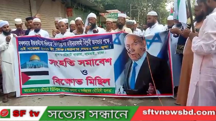 আজ ঢাকার ধামরাই উপজেলার চৌহাট ইউনিয়নের বিভিন্ন মসজিদের পক্ষ থেকে ফিলিস্তিনে বর্বর ইসরায়েল কর্তৃক শিশু হত্যাসহ নারকীয় হত্যাযঙ্গের প্রতিবাদে মানববন্ধন করেছে সাধারণ মুসল্লীরা।