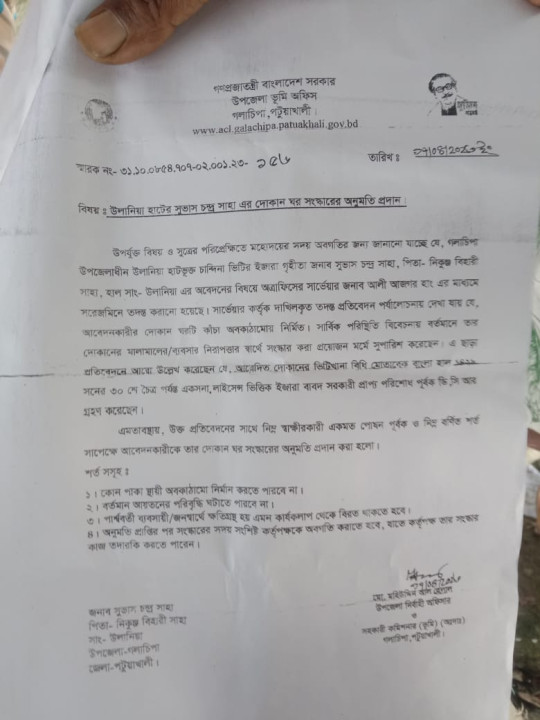 উলানিয়া বন্দর সুভাষ চন্দ্র সাহা এর দোকান ঘর সংস্কারের অনুমতি প্রদান, নাই স্থানে ঘর।
