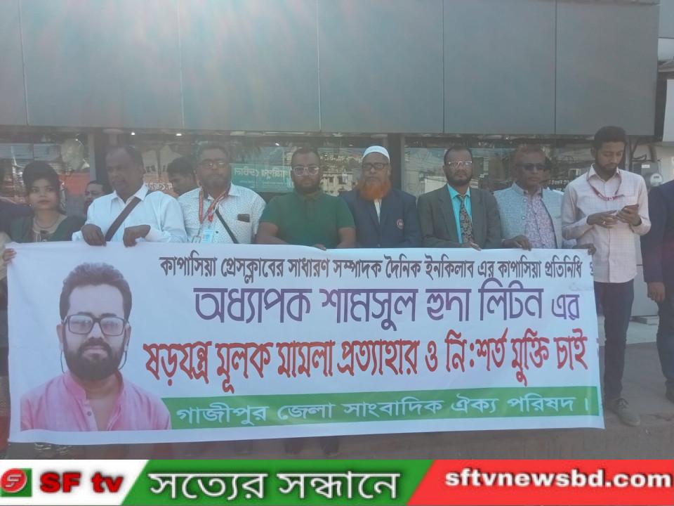 গাজীপুরের কাপাসিয়ার প্রেস ক্লাবের সাধারণ সম্পাদক ও দৈনিক ইনকিলাবের কাপাসিয়া প্রতিনিধি অধ্যাপক শামসুল হুদা লিটনের মুক্তি ও মিথ্যা মামলা প্রত্যাহারের দাবিতে মানববন্ধন করেছে কালিয়াকৈর উপজেলা ও গাজীপুর জেলার সাংবাদিকরা। আজ রবিবার ২৬শে নভেম্বর গাজীপুর জেলা পুলিশ সুপার কার্যালয়ের সামনে এ মানববন্ধন অনুষ্ঠিত হয় , মানববন্ধনে গাজীপুর জেলা সাংবাদিক ঐক্য পরিষদের সভাপতি ও আলোকিত বাংলাদেশ পত্রিকার নিজস্ব প্রতিবেদক অধ্যাপক আবুল হোসেন চৌধুরীর সভাপতিত্বে এবং বেলায়েত হোসেন শামীম ও নাসির উদ্দিন এর সঞ্চালনায় বক্তব্য রাখেন,বাংলাদেশ প্রেসক্লাবের কালিয়াকৈর শাখার সভাপতি ও গাজীপুর জেলা সাংবাদিক ঐক্য পরিষদের সহ সভাপতি মো:নাজিম উদ্দিন, দৈনিক আমাদের সময় পত্রিকার গাজীপুর প্রতিনিধি রফিকুল ইসলাম, গাজীপুর মহানগর প্রেসক্লাবের আক্তারুজ্জামান, আমার জনতা পত্রিকার সম্পাদক সানাউল্লাহ নূরী, সাংবাদিক নুরুল হক ভূঁইয়া, দৈনিক গণকন্ঠ পত্রিকার গাজীপুর জেলা প্রতিনিধি মোঃ আনোয়ার হোসেন,এস এফ টি টিভির কালিয়াকৈর উপজেলা প্রতিনিধি ও কালিয়াকৈর মডেল প্রেস ক্লাবের সিনিয়র সহ সভাপতি কাজী আহসানুল হাবীব প্রমুখ।উল্লেখ্য গ্রেফতার কৃত লিটন গাজীপুর জেলা সাংবাদিক ঐক্য পরিষদের একজন সম্মানীত সদস্যও।তার নি:শর্ত মুক্তির দাবীতে কালিয়াকৈর,কালিগঞ্জ,কাপাসিয়া, শ্রীপুর ও গাজীপুর এর সকল সাংবাদিক বৃন্দ উপস্থিত হয়ে মানব বন্ধন করে এবং ডিসি ও এস,পি বরাবর স্মারকলিপি প্রদান করেন।