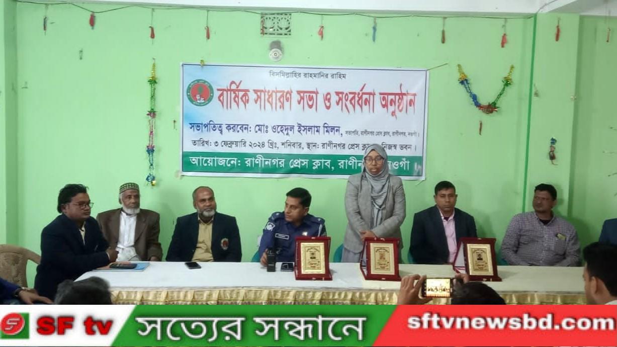 প্রেস ক্লাবের আয়োজনে অনুষ্ঠিত বার্ষিক সাধারণ সভায় সভাপতিত্ব করে রাণীনগর প্রেস ক্লাবের সভাপতি মো: ওহেদুল ইসলাম মিলন। অনুষ্ঠানে প্রধান অতিথি হিসেবে বক্তব্য রাখেন,উপজেলা নির্বাহী কর্মকর্তা উম্মে তাবাসসুম। বিশেষ অতিথি হিসেবে,উপজেলা সহকারী কমিশনার (ভূমি) মোহাম্মদ হাফিজুর রহমান,রাণীনগর থানার ভারপ্রাপ্ত কর্মকর্তা (ওসি) আবু ওবায়েদ ও থানার ইন্সপেক্টর (তদন্ত) মেহেদী মাসুদসহ রাণীনগর প্রেস ক্লাবের প্রতিষ্ঠাতা সভাপতি গোলাম কিবরিয়া,সাবেক সভাপতি অধ্যক্ষ হারুনুর রশিদ,এসএম সাইফুল ইসলাম,সম্পাদক শাহরুখ হোসেন আহাদ,সাবেক সাধারণ সম্পাদক শহিদুল ইসলাম,যুগ্ন সাধারণ সম্পাদক আবুল বাসার চঞ্চল প্রমূখ বক্তব্য রাখেন।