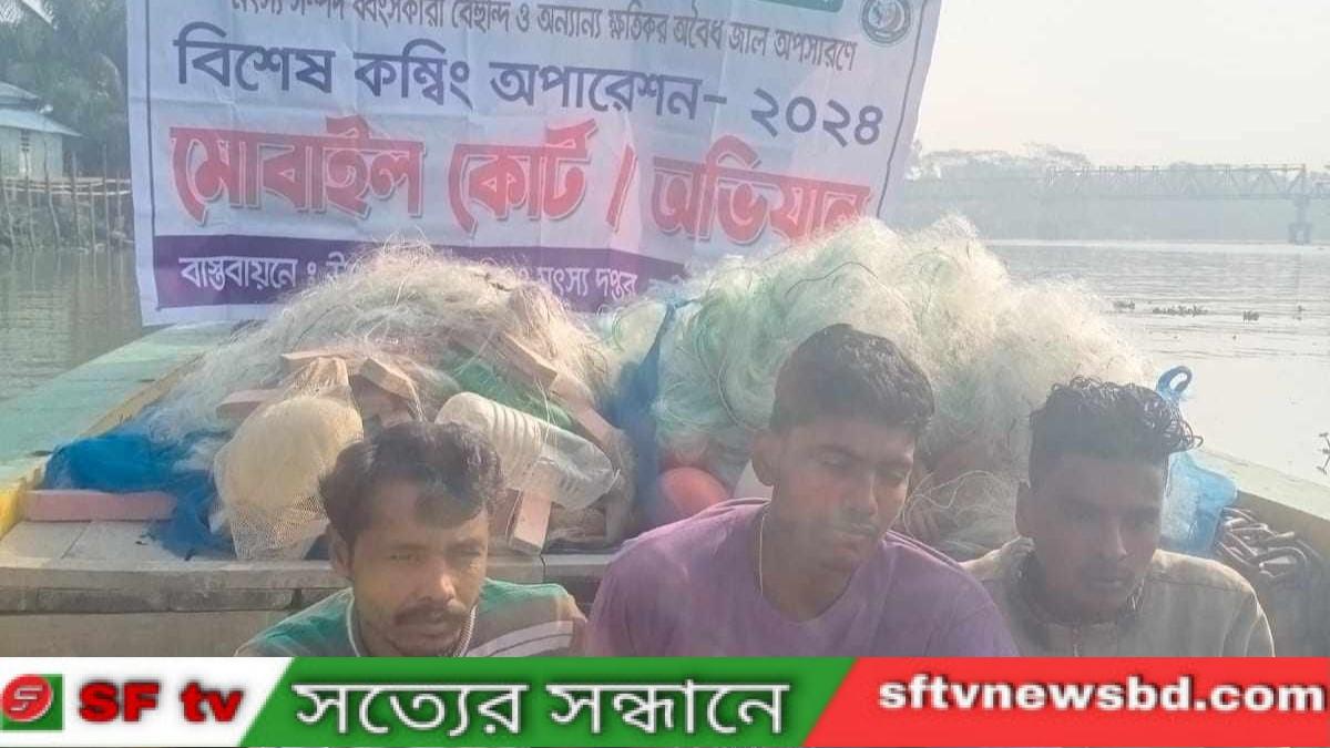 পিরোজপুর কাউখালী উপজেলায় মৎস্য সম্পদ ধ্বংসকারী অবৈধ জাল কম্বিং অপারেশন মোবাইল কোর্ট পরিচালনাকালে সন্ধ্যা নদী থেকে ৩০০০ মিটার কারেন্ট জাল জব্দ ও ৩ জন জেলেকে আটক। পরবর্তীতে মোট ১২০০০ টাকা জরিমানা। ১১ ফেব্রুয়ারি ২০২৪ সকাল ৯:৩০ সময় কাউখালী সন্ধ্যা নদী থেকে অবৈধ কারেন্ট জাল দিয়ে মাছ শিকার করায় তিন জেলেকে ১২ হাজার টাকা জরিমানা করেছে ভ্রাম্যমাণ আদালত। সকালে ভ্রাম্যমাণ আদালতের নির্বাহী ম্যাজিস্ট্রেট ও উপজেলা সহকারী কমিশনার (ভূমি) মোঃ বায়েজিদুর রহমান এ অর্থদণ্ড দেন। ভ্রাম্যমাণ আদালত সূত্রে জানায়, ইলিশ সম্পদ উন্নয়ন ও ব্যবস্হাপনা প্রকল্পের আওতায় বিশেষ কম্বিং অপারেশনের অংশ হিসেবে কাউখালী উপজেলা প্রশাসন ও মৎস্য অধিদপ্তর চিরাপাড়া নদীতে অভিযান পরিচালনা করেন। এ সময় তিন হাজার মিটার অবৈধ কারেন্ট জাল সহ চিরাপাড়া গ্রামের, শের আলীর ছেলে সজিব (১৮), বড় বিড়ালজুরি গ্রামের ইদ্রিস খন্দকারের ছেলে সাইফুল ইসলাম (৪৭) ও সোনাকুর গ্রামের মোঃ খলিল শেখের ছেলে পারভেজ শেখ (২০) নামের তিন জেলকে আটক করা হয়। পরে ভ্রাম্যমাণ আদালতের নির্বাহী ম্যাজিস্ট্রেট অবৈধ জাল দিয়ে মাছ ধরার অপরাধে মৎস্য সুরক্ষা ও সংরক্ষণ আইনে এক জেলেকে দুই হাজার টাকা ও দুই জেলেকে পাঁচ হাজার টাকা করে ১২ হাজার টাকা জরিমানা করেন।জব্দকৃত জাল জনসম্মুখে আগুনে পুড়িয়ে বিনষ্ট করা হয়। এ সময় নৌ পুলিশের সদস্যরা উপস্থিত ছিলেন। উপজেলা মৎস্য কর্মকর্তা মোঃ হাফিজুর রহমান বলেন, নদীতে মাছ শিকারে কারেন্ট জাল ব্যবহার সম্পূর্ণ অবৈধ। এ জালের বিরুদ্ধে প্রশাসনের অভিযান অব্যাহত থাকবে।