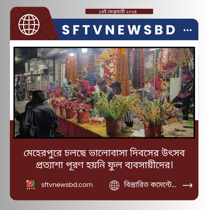 এদিকে মেহেরপুরে চলছে ভালোবাসা দিবসের বিভিন্ন উৎসব। তবে প্রত্যাশা পূরণ হয়নি এই এলাকার ফুল ব্যবসায়ীদের। অন্যান্য বছরগুলোতে এই দিবসটিতে লক্ষ লক্ষ টাকার ফুল বিক্রি হলেও এবছর ফুল ব্যবসায়ীদের তেমন একটা বিক্রি হয়নি বলে জানা গেছে। ফুল ব্যবসায়ীরা ধারণা করছেন স্কুল কলেজ বন্ধ এবং এসএসসি পরীক্ষার কারণে অনেকেই ঘর থেকে বের হতে পারেনি,আবার এবছর বাজারে বেশি দামে ফুল কিনতে হচ্ছে, অনেকেই আবার ফুল কিনে নিয়ে গেছে বাবা মা ভাই বোন সহ প্রিয়জনদের জন্য। মেহেরপুর শহরের হোটেল বাজারে ফুল কিনতে আসা কলেজ পড়ুয়া শিক্ষার্থী সামিয়া আক্তার বলেন আসলে ভালোবাসার কোন দিবস হয় না, তবে তারপরেও বলে না প্রচলিত হয়ে গেছে সেজন্যই আমিও আমার বাবা-মা ভাই বোনদের সাথে দিবসটি উদযাপন করার জন্য ফুল কিনতে এসেছি ফুল কিনেছিও বেশ কিছু। শহরের বড় বাজারে এলাকায় ফুল কিনতে আসা এস এ শিল্টু নামের এক যুবকের সাথে কথা বললে তিনি বলেন, ফুল কিনতে এসেছি কিন্তু ফুলের যে দাম অন্যান্য সময়ের চারগুণ। এক একটা গোলাপ ফুল বিক্রি হচ্ছে ৪০ থেকে ৫০ টাকা পিচ। এত টাকা দিয়ে ফুল কেনাও কষ্টের বিষয়।