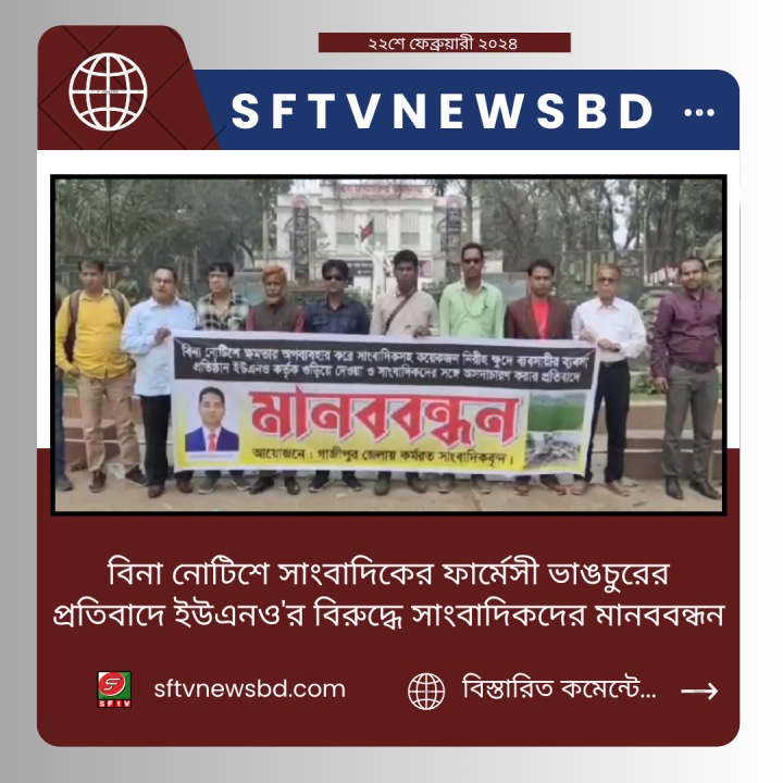 বিনা নোটিশে সাংবাদিকের একটি ঔষধের ফার্মেসী গুঁড়িয়ে দেওয়ার প্রতিবাদে সেই আলোচিত ইউএনও’র বিরুদ্ধে মানববন্ধন করেছেন গাজীপুর ও কালিয়াকৈরের বিভিন্ন ইলেকট্রনিক্স ও প্রিন্ট মিডিয়া সাংবাদিকবৃন্দ ।