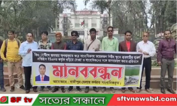 বৃহস্পতিবার দুপুরে গাজীপুরে কর্মরত সাংবাদিকরা গাজীপুর জেলা প্রশাসকের কার্যালয়ের সামনে এ মানববন্ধনের আয়োজন করেন। কালিয়াকৈর মডেল প্রেসক্লাবের সাধারণ সম্পাদক দৈনিক আজকালের খবর কালিয়াকৈর উপজেলা প্রতিনিধি হুমায়ুন কবিরের সঞ্চালনায় মানববন্ধনে বক্তব্য রাখেন, গাজীপুর প্রেসক্লাবের সাধারণ সম্পাদক মাহতাব উদ্দিন, সহ-সভাপতি ফরিদ উদ্দিন, যমুনা টেলিভিশনের গাজীপুর জেলা প্রতিনিধি হোসাইন আলী বাবু , নাগরিক টেলিভিশনের গাজীপুর জেলা প্রতিনিধি আল-আমিন, দীপ্ত টেলিভিশনের গাজীপুর জেলা প্রতিনিধি জাহাঙ্গীর আলম, আনন্দ টেলিভিশনের কালিয়াকৈর উপজেলা প্রতিনিধি আফসার খান বিপুল, কালিয়াকৈর মডেল প্রেসক্লাবের সহ-সভাপতি মোশাররফ হোসেন ও কালিয়াকৈর মডেল প্রেসক্লাবের সভাপতি ভুক্তভোগী সাংবাদিক ইমারত হোসেন। এসময় গাজীপুর জেলার ও কালিয়াকৈর মডেল প্রেসক্লাবের সকল সাংবাদিকসহ বিভিন্ন প্রিন্ট ও ইলেকট্রনিক্স মিডিয়ার সাংবাদিকরা উপস্থিত ছিলেন।মানববন্ধনে বক্তারা বলেন, সরকারি জমির উপর দোকান বা বাড়িঘর থাকলেও নিয়ম অনুযায়ী যারা ওই জমিতে খাজনা পরিশোধ করে দোকানপাট নির্মাণ করে ব্যবসা পরিচালনা বা বসবাস করে আসছে তাদেরকে নোটিশ প্রদান করতে হবে। নোটিশ প্রদান করা ছাড়া কোন স্থাপনা ভাঙতে পারবে না। কিন্তু উপজেলার চা বাগান বাজারে ইমারত হোসেন দীর্ঘ ৩৬/৩৭ বছর ধরে সরকারি প্যারেফেরি করা জমির উপরে ফার্মেসী নির্মাণ করে ব্যবসা চালিয়ে আসছিল । গত ২১ফেব্রুয়ারি আন্তর্জাতিক মাতৃভাষা দিবসে উপজেলা নির্বাহী কর্মকর্তা হোসাইন মোহাম্মদ হাই জকী সাংবাদিকের উপর আক্রোশ দেখিয়ে বিনা নোটিশে নিমিষেই তার ঔষধের দোকানসহ আরো তিনটি দোকান ভেঙ্গে দিয়ে সেখান থেকে প্রস্থান করেন। অনেকটা ফিল্মি স্টাইলে। এলেন ভাংগলেন,কেউ কিছু বুঝার আগে, চলেও গেলেন।এসময় দোকানে থাকা কোন মালামাল বের করার জন্য কোন সময় প্রদান না করে ভেকু দিয়ে সমস্ত মালামাল তছনছ করাসহ দোকান গুঁড়িয়ে দেয়। তার দুর্নীতির নিউজ প্রচার ও প্রকাশ করার কারনেই তিনি ওই দোকানে অভিযান পরিচালনা করে গুড়িয়ে দেয়। আমরা এই মানববন্ধনের মাধ্যমে তীব্র নিন্দা ও প্রতিবাদ জানাচ্ছি। তাছাড়া ওই উপজেলা নির্বাহী কর্মকর্তা ফেব্রুয়ারীর ২০তারিখে বদলী হলেও, কি করে? ২১ফেব্রুয়ারি বন্ধের দিনে অভিযান পরিচালনা করেন। তার স্থানে অন্য কোন উপজেলা নির্বাহী কর্মকর্তা থাকার কথা? এটা আইনগত ভাবে অবৈধ হইছে।কালিয়াকৈর মডেল প্রেসক্লাবের সাংবাদিকসহ গাজীপুর জেলা প্রতিনিধিরা ইউএনও,র নানা অপকর্ম নিয়ে ইলেকট্রনিক্স এবং প্রিন্ট মিডিয়ায় সংবাদ প্রকাশের জেরে তিনি ক্ষিপ্ত হয়ে কালিয়াকৈর মডেল প্রেসক্লাবের সভাপতিসহ অন্যান্য সাংবাদিকদের সাথে অসদাচরণ এবং সাংবাদি