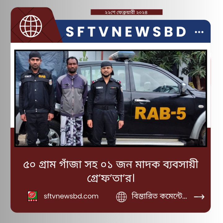 এরই ধারাবাহিকতায় সিপিসি-১, চাঁপাইনবাবগঞ্জ ক্যাম্প, র্যাব-৫, রাজশাহীর একটি আভিযানিক দল ২১ ফেব্রুয়ারী ২০২৪ ইং গোয়েন্দা তথ্যের ভিত্তিতে, চাঁপাইনবাবগঞ্জ জেলার শিবগঞ্জ থানাধীন শ্যামপুর ইউপির গোপালনগর হুদমাপাড়া এলাকায় অভিযান পরিচালনা করে । মোঃ জেন্টু (৩৫),পিতা- মৃত আজাহার আলী, মাতা-মোছাঃ কেতামন বিবি,সাং- গোপাল নগর হুদমাপাড়া,থানা- শিবগঞ্জ, জেলা-চাঁপাইনবাবগঞ্জকে ৫০ (পঞ্চাশ)গ্রাম মাদকদ্রব্য গাঁজা সহ হাতেনাতে গ্রেফতার করা হয়।ধৃত আসামী এলাকার চিহ্নিত মাদক ব্যবসায়ী। নিয়মিত সে মাদকদ্রব্য গাঁজা অজ্ঞাত মাদকব্যবসায়িদের নিকট থেকে সংগ্রহ করে গ্যাস সিলিন্ডারের মাধ্যমে বহন করে এবং সেখানে লুকিয়ে রেখে চাঁপাইনবাবগঞ্জের শিবগঞ্জ এলাকায় পাইকারী/খুচরা বিক্রি করতো। এরূপ গোয়েন্দা তথ্যের ভিত্তিতে ২১ ফেব্রæয়ারি ২০২৪ ইং তারিখ ২৩:৫০ ঘটিকায় চাঁপাইনবাবগঞ্জ জেলার শিবগঞ্জ থানাধীন শ্যামপুর ইউনিয়নের ৭নং ওয়ার্ড, গোপালনগর হুদমাপাড়া গ্রামস্থ ধৃত আসামী মোঃ জেন্টু (৩৫) এর বসতবাড়িতে অভিযান পরিচালনা করে আসামী ১। মোঃ জেন্টু (৩৫), পিতা- মৃত আজাহার আলী, মাতা-মোছাঃ কেতামন বিবি, সাং- গোপাল নগর হুদমাপাড়া, থানা- শিবগঞ্জ, জেলা- চাঁপাইনবাবগঞ্জকে ৫০ গ্রাম গাঁজা ও বিশেষ কায়দায় কাটা ০২ টি গ্যাস সিলিন্ডার উদ্ধার করে।