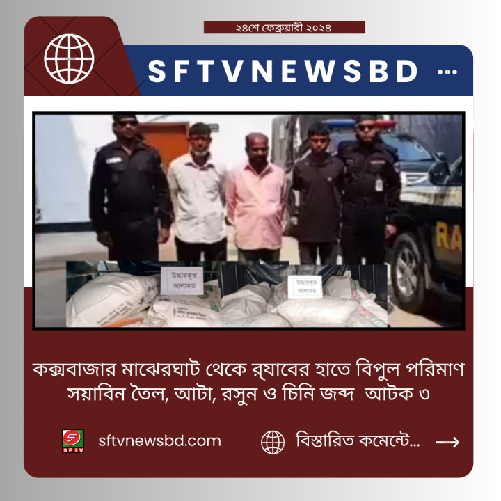 কক্সবাজার মাঝেরঘাট থেকে র‌্যাবের হাতে বিপুল পরিমাণ সয়াবিন তৈল, আটা, রসুন ও চিনি জব্দ  আটক ৩।