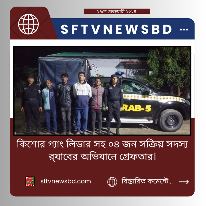 ২৬/০২/২০২৪ তারিখ দিবাগত রাতে মাদক সংক্রান্ত একটি গোপন তথ্যের ভিত্তিতে উল্লেখিত এলাকায় র্যাব এর একটি চৌকস আভিযানিক দল অভিযান পরিচালনা করার সময় গভীর রাতে শিবতলা মোড় বেলতলা মসজিদ সংলগ্ন এলাকায় উক্ত গ্যাং এর সদস্যদের মাদক সেবনের সরঞ্জামাদিসহ মাদক সেবনরত অবস্থায় দেখতে পায়। র্যাব এর উপস্থিতি টের পেয়ে তারা দৌড়ে পালিয়ে যাওয়ার সময় কিশোর গ্যাং গ্রæপের ০৪ জন সক্রিয় সদস্যকে গ্রেফতার করা হয়। ২৭ ফেব্রুয়ারী ২০২৪ তারিখ চাঁপাইনববাগঞ্জ জেলার সদর থানাধীন শিবতলা মোড় বেলতলা মসজিদ সংলগ্ন এলাকায় অভিযান পরিচালনা করে কিশোর গ্যাং এর ০৪ জন সক্রিয় সদস্য যথাক্রমে ১। মোঃ পাভেল আলী (২৬), পিতা- মোঃ নজরুল ইসলাম, মাতা- মোছাঃ রুবি বেগম,২। মোঃ হামিম ওরফে সালমান (২৯), পিতা- মোঃ খায়রুল ইসলাম, মাতা-মোছাঃ নার্গিস, উভয় সাং- পিটিআই বস্তি, ৩। মোঃ সেলিম (২৭), পিতা- মৃত আয়নাল হক, মাতা- লতিফা বেগম, সাং- মসজিদ পাড়া, ৪। শ্রী কার্তিক কর্মকার(৩০), পিতা- মৃত অনিল কর্মকার, মাতা-অঞ্জনা কর্মকার, সাং- শিবতলা মালোপাড়া, সর্বথানা- চাঁপাইনবাবগঞ্জ সদর, জেলা- চাঁপাইনবাবগঞ্জ ’দেরকে মাদক সেবনরত অবস্থায় গ্রেফতার করা হয়।