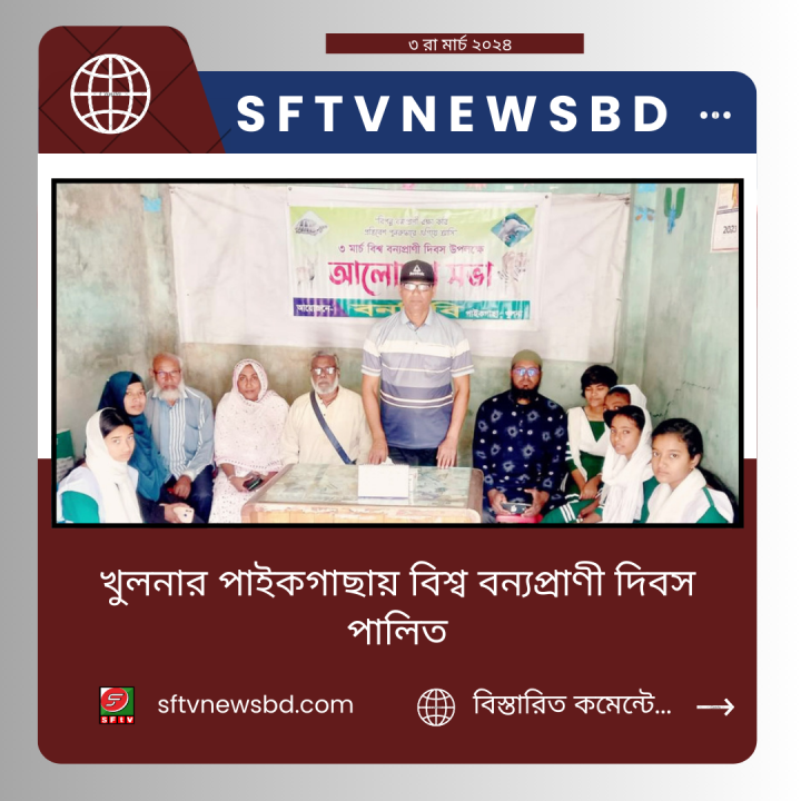খুলনার পাইকগাছায় বিশ্ব বন্যপ্রাণী দিবস পালিত হয়েছে। পরিবেশবাদী সংগঠণ বনবিবির আয়োজনে ৩ মার্চ রবিবার বেলা ১২টায় পাইকগাছার নতুন বাজারস্থ কার্যালয়ে আলোচনা সভায় সভাপতিত্ব করেন উক্ত সংগঠনের সভাপতি লেখক ও সাংবাদিক প্রকাশ ঘোষ বিধান।সভায় বক্তৃতা করেন, প্রেসক্লাব পাইকগাছার সাধারণ সম্পাদক এম জালাল উদ্দিন, সাংবাদিক আব্দুল মজিদ সরদার, সপ্তদ্বীপা সাহিত্য পরিষদের দপ্তর সম্পাদক রোজী সিদ্দিকী, রাবেয়া আক্তার মলি, পরিবেশ কর্মি গনেশ দাশ, দিবাশীস সাধু,মোজাম সরদার, দিপান্বীতা অধিকারী, মনিরা আহম্মদ, সেতু আক্তার তুলি,লাবিবা আক্তার লোচমী, লিনজা আক্তার মিথিলা প্রমুখ।আয়োজিত অনুষ্ঠানে বক্তারা বলেন, জলবায়ু পরিবর্তন ও মানুষের লোভে বনের বাস্তুতন্ত্র নষ্ট হয়ে যাওয়া সহ নানা কারণে বন্যপ্রাণীরা বিলুপ্তির পথে। এজন্য পরিবেশ ও প্রতিবেশ টিকিয়ে রাখতে মানুষের পাশাপাশি বন্যপ্রাণীদের সমানভাবে মর্যাদা দিতে। এছাড়াও বন্যপ্রাণীদের সংরক্ষণ করার জন্য দিনটি পালন করা অত্যন্ত জরুরি বলে অভিমত ব্যক্ত করেন বক্তারা।