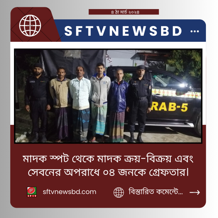 গোয়েন্দা তথ্যের ভিত্তিতে জানা যায় যে, উল্লেখিত এলাকায় মাদক ব্যবসায়ীরা মাদক বিক্রয় করছে এবং মাদক সেবীরা ব্যবসায়ীদের নিকট থেকে ক্রয় করে আসর বসিয়ে মাদক সেবন করছে। র্যাব এর একটি আভিযানিক দল পূর্ব পরিকল্পনা মোতাবেক উক্ত স্থানে অবস্থান নিলে মাদক ক্রয়-বিক্রয় এবং সেবনের সময় তাদেরকে হাতেনাতে গ্রেফতার করে।০৩ মার্চ ২০২৪ ইং তারিখ ২৩:৩০ ঘটিকায় চাঁপাইনববাগঞ্জ জেলার সদর থানাধীন মহানন্দা নদীর পাড় সংলগ্ন এলাকায় অভিযান পরিচালনা করে মাদক ক্রয়-বিক্রয় এবং সেবনের অপরাধে ১। মোঃ তসিকুল হোসেন (৪২), পিতা-মৃত তফতর হোসেন, ২। মোঃ জাহাঙ্গীর আলম (৩৭), পিতা-মৃত অনু মিয়া, ৩। মোঃ সাহাদাত হোসেন (৩২), পিতা-মোঃ সাইদুর রহমান, ৪। মোঃ আরিফ (৩৬), পিতা-মৃত গোলাম মোস্তফা, সর্ব সাং-বালিয়াডাঙ্গা, থানা-চাঁপাইনবাবগঞ্জ সদর, জেলা-চাঁপাইনবাবগঞ্জ’দেরকে মাদক এবং মাদক সেবনের সরঞ্জামাদি সহ হাতেনাতে গ্রেফতার করে।