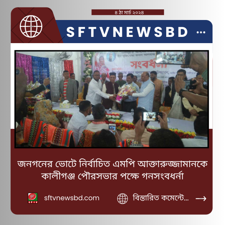 এসময় উপস্থিত সকলে ফুল দিয়ে শুভেচ্ছা জানান এবং গন সংবধর্ণা দেন জনগনের ভোটে নির্বাচিত এমপি আক্তারুজ্জামানকে ।আজ সোমবার (৪ ফেব্রুয়ারী) সকালে কালীগঞ্জ পৌরসভার সম্মেলন কক্ষে সংবধর্ণা অনুষ্ঠানের আয়োজন করা হয়েছে।এ সময় সভাপতির বক্তব্যে মেয়র এমএম রবিন হোসেন বলেন গত ১৪ বছর পৌরসভার কোন উন্নয়ন হয় নাই। প্রধান অতিথি পৌর সুবিধা বঞ্চিত নাগরিকদের উন্নয়নে বিভিন্ন রোড ম্যাপ দিয়ে নাগরীকদের উন্নয়নে সার্বিক সহযেগীতার আস্বাস প্রদান করেন।বক্তব্য রাখেন বিভিন্ন ওয়ার্ডের কাউন্সিলর ও সংরক্ষিত আসনের মহিলা সদস্যগন, উপজেলা আওয়ামী লীগ ও অঙ্গ সংগঠনের নেতৃবৃন্দ তাদের প্রিয় নেতাকে ফুলের তোড়া দিয়ে শুভেচ্ছা জানান।কালীগঞ্জ পৌর মেয়র এস এম রবীন হোসেন এর সভাপতিত্বে কাউন্সিলর মোঃ বাদল হোসেন ও রিয়াদ হাসান লিখন এর যৌথ সঞ্চালনায় গনসংবধর্ণা অনুষ্ঠানটি অনুষ্ঠিত হয়েছে।অন্যান্নদের মাঝে উপস্থিত ছিলেন জেলা আওয়ামীলীগের সাংগঠনিক সম্পাদক আশরাফী মেহেদী হাসান, তুমুলিয়া ইউপি চেয়ারম্যান আবু বকর (বাক্কু), বক্তারপুর ইউনিয়ন পরিষদ এর চেয়ারম্যান আতিকুর রহমান (ফারুক), জেলা আওয়ামী লীগের শ্রম বিষয়ক সম্পাদক তসলিমা রহমান লাভলী,জামালপুর ইউনিয়ন পরিষদ এর সাবেক চেয়ারম্যান ও জামালপুর ইউনিয়ন আওয়ামিলীগের সভাপতি, মাহবুবুর রহমান খাঁন (ফারুক মাষ্টার), কালীগঞ্জ পৌর আওয়ামী লীগের উপদেষ্টা মন্ডলীর সদস্য মোঃ ইব্রাহিম খন্দকার, কালীগঞ্জ,পৌর আওয়ামী যুব লীগের সহ-সভাপতি মো: লোকমান হোসেন (পনির), দপ্তর সম্পাদক মোঃ আশরাফুল হক (শিশির) কালীগঞ্জ উপজেলা জাতীয় শ্রমিকলীগের কার্য নির্বাহী সদস্য মোঃ ইউসুফ আলী, মো: মুক্তাদির হোসেন, কালীগঞ্জ পৌর জাতীয় শ্রমিক লীগের কার্য নির্বাহী সদস্য মু শফিকুল (কবির) সহ স্হানীয় আওয়ামী অঙ্গ সংগঠন এর নেতৃবৃন্দ উপস্থিত ছিলেন।সকলে কালীগঞ্জ পৌর শ্মশান ঘাটের একটি রাস্তা উদ্বোধন করেন। এ সময় কালীগঞ্জ পৌর শ্মশান ঘাটে কালীগঞ্জ উপজেলা ও বিভন্ন ইউনিয়ন আওয়ামী লীগের অঙ্গ সংগঠন এর নেতৃত্ব বৃন্দ উপস্থিত ছিলেন।