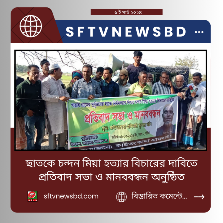 সুনামগঞ্জের ছাতক খারাই গ্রামের দুর্বৃত্তদের হাতে নিহত চন্দন মিয়া হত্যার বিচারের দাবিতে প্রতিবাদ সভা ও মানববন্ধন অনুষ্ঠিত হয়েছে ।