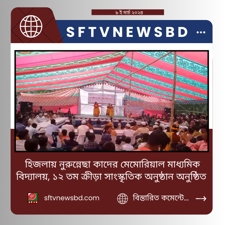 আজ ৮ ই মার্চ শুক্রবার ৷ বরিশালের হিজলা উপজেলার, হরিনাথপুরের গংঙ্গাপুর, নুরুন্নেছা কাদের মেমোরিয়াল মাধ্যমিক বিদ্যালয়, ১২ তম ক্রীড়া সাংস্কৃতিক অনুষ্ঠান হয় ৷