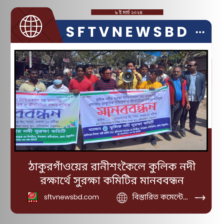 ঠাকুরগাঁওয়ের রানীশংকৈলে ৯ মার্চ সকাল ১১ঘটিকার সময় উপজেলা পরিষদের প্রধান ফটকের সামনে কুলিক নদী সুরক্ষা কমিটি আয়োজনে এক মানব বন্ধন অনুষ্ঠিত হয়।