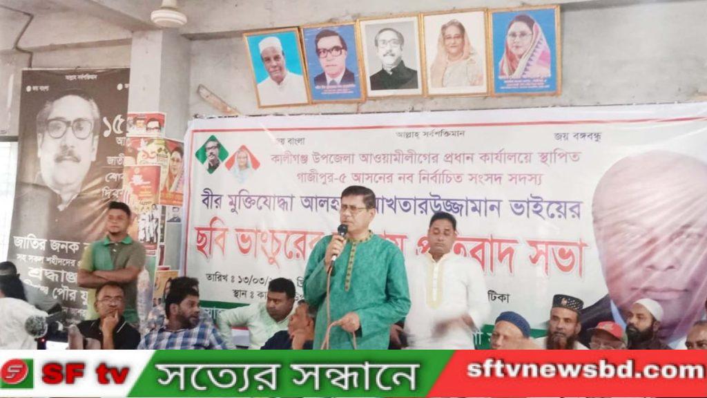 গাজীপুরের কালীগঞ্জ উপজেলা আওয়ামী লীগ কার্যালয়ের স্থাপিত গাজীপুর-৫ আসনের নব নির্বাচিত সংসদ সদস্য বীর মুক্তিযোদ্ধা আলহাজ্ব আখতারউজ্জামান এর ছবি ভাংচুরের ঘটনায় প্রতিবাদ সভা অনুষ্ঠি হয়েছে।