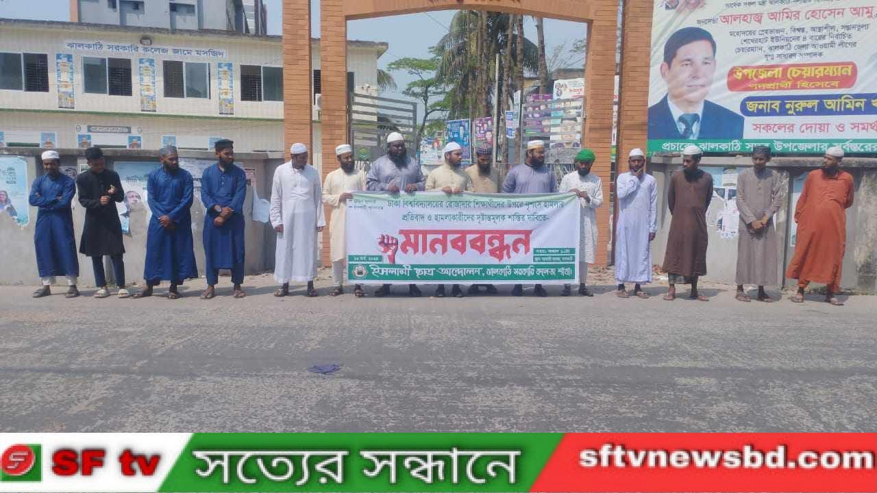 ক্যাম্পাসে শিক্ষার্থীদের নিরাপত্তা নিশ্চিত এবং পবিত্র রমজান মাসে মুসলিম শিক্ষার্থীদের ওপর বিদ্বেষ চর্চা ও হামলার ঘটনার প্রেক্ষিতে ইসলামী ছাত্র আন্দোলন বাংলাদেশ ঝালকাঠি জেলা শাখার ব্যবস্থাপনায় ঝালকাঠি সরকারি কলেজ শাখা উদ্যোগে আজ ১৬ই মার্চ, রোজঃ শনিবার সকাল -১০ ঘটিকায় সরকারি কলেজ এর সামনে মানববন্ধন কর্মসূচি অনুষ্ঠিত হয়।অনুষ্ঠানের প্রধান অতিথি হিসেবে উপস্থিত ছিলেন, ইসলামী ছাত্র আন্দোলন বাংলাদেশ ঝালকাঠি জেলা শাখার মুহতারাম সভাপতি মোঃ ইব্রাহিম খলিল, বিশেষ অতিথি হিসেবে উপস্থিত ছিলেন, ঝালকাঠি জেলা শাখার সাধারণ সম্পাদক, মোঃ আব্দুল কাদের তাওহিদী,অর্থ ও কল্যাণ সম্পাদক মোহাম্মদ দ্বীন ইসলাম, স্কুল কলেজ সম্পাদক মোঃ আশিক কাজী,আরো উপস্থিত ছিলেন, ঝালকাঠি সদর পূর্ব শাখার সভাপতি মোঃ মারেফাতুল্লাহ,ঝালকাঠি সদর পশ্চিম শাখার সভাপতি, মোঃ ফেরদৌস সহ প্রমুখ নেতৃবৃন্দ।