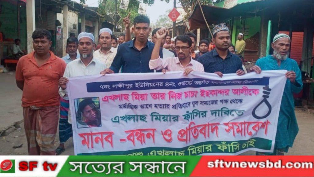 সুনামগঞ্জের দোয়ারাবাজার উপজেলা ৭নং লক্ষীপুর ইউনিয়নের ৪নং ওয়ার্ডের ফতেহপুর গ্রামের ইসকন্দর আলীর মর্মান্তিক ভাবে হত্যার প্রতিবাদের ও স্থানীয় ও প্রবাসীদের পক্ষ থেকে নরপশু এখলাছ মিয়াকে ফাঁসির দাবিতে এরুয়াখাই চকবাজারে এক বিশাল মানব বন্ধন ও প্রতিবাদ সমাবেশের আয়োজন করা হয়েছে। শনিবার (১৬ মার্চ) বিকেলে উপজেলার লক্ষীপুর ইউনিয়নের চক বাজারে এ ঘটনার প্রতিবাদে স্থানীয় প্রবাসীদের পক্ষ থেকে মানববন্ধন ও প্রতিবাদ সমাবেশে নরপশু এখলাছ মিয়ার ফাঁসির দাবী জানান। মানববন্ধনে পুত্র আব্দুস সোবহান কান্নায ভেঙ্গে পরে পিতার ন্যায় বিচার কামনা করেছেন সংশ্লিষ্ট কর্তৃপক্ষের নিকট । এ সময় উপস্থিত ছিলেন বিশিষ্ট ব্যবসায়ী লিটন মিয়া, আওয়ামী লীগ নেতা আব্দুল কাদির, আলিম উদ্দিন মাস্টার, মোঃ কামাল উদ্দিন, ফারুক আহমেদ, জামাল আহমদ, আহমদ আলী, নুর নবী, মোছব্বির আলী বাচ্ছু মিয়া, মনির হোসেন, আল আমিন, বিভিন্ন রাজনৈতিক সামাজিক সালিশ ব্যক্তিত্বরা বক্তারা এ সময় বক্তারা বলেন ঘাতক একলাছ মিয়া অযথা গ্রামবাসীর উপর বিভিন্ন ভাবে মামলা দিয়ে হয়রানি করেছে কিছুদিন আগে তার আপন বোনের সংসার নষ্ট করে সে আপন বোনের সাথে কুকর্মে লিপ্ত থাকায় এলাকাবাসী থাকে বিভিন্ন ভাবে শাস্তি প্রদান করে সে একজন সমাজ বহির্ভূক্ত লোক সে টাকার প্রভাব খাটিয়ে নানা রকম অসামাজিক কার্যকলাপ করে আসছে। তার কাছে কোন ধর্মের তোয়াক্কা নেই সে অনেক ধর্ম এবং সমাজ বিরোধী কার্যকলাপ করে আসছে তাই এলাকাবাসী একটাই দাবি তার যেন ফাঁসি কার্যকর হয়।। বিগত ইউনিয়ন পরিষদ নির্বাচনে নৌকার প্রার্থী আওয়ামী লীগ নেতা মোহাম্মদ আব্দুল কাদির বলেন এখলাস মিয়া অত্যন্ত খারাপ লোক সে তার আপন চাচা মৃত ইস্কন্দর আলীর বিরুদ্ধে একাধিক মামলা করে তাকে অনেক বার জেল খাটিয়েছে এবং তার আপন ছোট বোনের সাথে খারাপ কাজে লিপ্ত থাকায় অনেক সালিশ হয়েছে এবং তার বোনের জামাই তার বোনকে ডিভোর্স দিয়েছে । চকবাজারের বিশিষ্ট ব্যবসায়ী লিটন মিয়া একলাছ মিয়া সম্বন্ধে সমস্ত লক্ষ্মীপুর ইউনিয়ন বাসি জানে সে খুব দুশ্চরিত্রা সে আপন বোনের সংসার নষ্ট করে দিয়েছে। তার যৌন লালসার শিকার আপন বোন ।