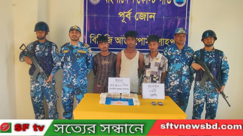 কোস্টগার্ড সদর দপ্তরের মিডিয়া কর্মকর্তা লেফটেন্যান্ট কমান্ডার খন্দকার মুনিফ তকি গণমাধ্যমকে এসব তথ্য জানান। তিনি বলেন,রবিবার (১৭মার্চ) গোপন সংবাদের ভিত্তিতে মিয়ানমার থেকে একটি মাদকের চালান টেকনাফ থানাধীন শাহপরীরদ্বীপ হয়ে বাংলাদেশে প্রবেশ করবে। এমন তথ্যের ভিত্তিতে বাংলাদেশ কোস্টগার্ড পূর্ব জোনের অধীনস্থ বিসিজি আউটপোস্ট শাহপরীরদ্বীপ কর্তৃক টেকনাফ থানাধীন নাফনদীর মোহনা এলাকায় একটি বিশেষ অভিযান পরিচালনা করা হয়। অভিযান চলাকালীন শাহপরীরদ্বীপের গোলাপাড়া ঝাউবন এলাকায় সন্দেহজনক একটি বোট আটক করা হয়। পরবর্তীতে বোটটি তল্লাশি চালিয়ে ৩৩ হাজার ৪০০ পিস ইয়াবা,২টি মোবাইল ফোন ও ১টি ইঞ্জিন চালিত কাঠের বোটসহ কামাল হোসেন (১৭), মাজেদ হোসেন (২৩), মোস্তফা কামাল (১৬) নামক ৩ মাদক পাচারকারীকে আটক করা হয়। প্রাথমিক জিজ্ঞাসাবাদে জানা যায় আটককৃতরা সবাই কক্সবাজার জেলার টেকনাফ উপজেলাধীন শাহপরীরদ্বীপের বাসিন্দা। তিনি আরও বলেন, জব্দকৃত ইয়াবার পরবর্তী আইনানুগ ব্যবস্থা গ্রহণের জন্য টেকনাফ মডেল থানায় হস্তান্তর করা হয়।