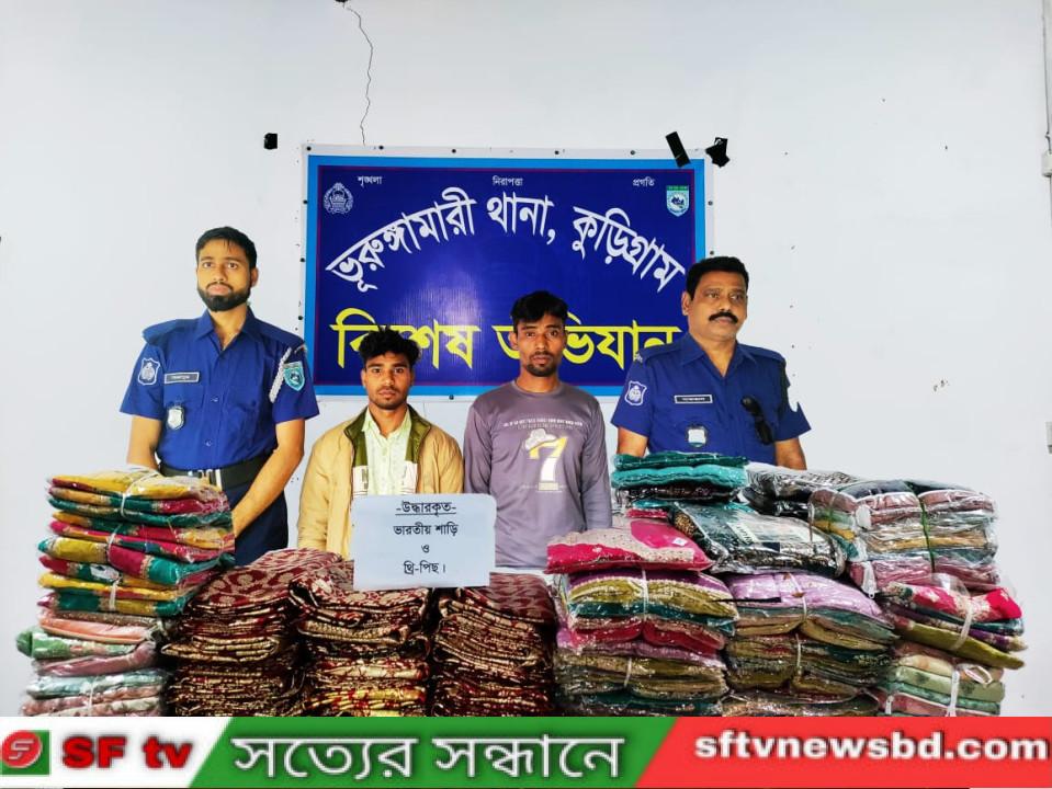 কুড়িগ্রাম জেলার ভূরুঙ্গামারী থানা পুলিশের একটি চৌকস টিম গত ২২ মার্চ ২০২৪ রাত আনুমানিক ১২.৪৫ ঘটিকার সময় ভূরুঙ্গামারী থানাধীন সোনাতলী পুকুরপাড় এলাকা থেকে শুল্ক ফাঁকি দিয়ে অবৈধ পথে ভারত থেকে বাংলাদেশে আনা ৬৬১ পিস ভারতীয় কাপড় চোরাকারবারির সময় পূর্ব ভোটহাট গ্রামের কুখ্যাত চোরাকারবারি মোঃ আঃ হাকিম এবং মোঃ মফিজুল হক দ্বরকে হাতেনাতে গ্রেফতার করে। এসময় চোরাচালানের কাজে ব্যবহৃত দুইটি অটোরিকশা জ্বদ করা হয়।