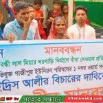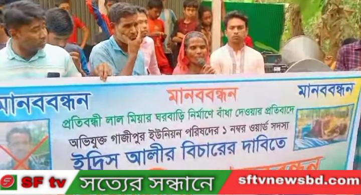 প্রতিবন্ধী লাল মিয়ার বসতবাড়ি নির্মাণে ইউপি সদস্যের বাঁধার প্রতিবাদে মানববন্ধন ও বিক্ষোভ মিছিল করছে স্থানীয় গ্রামবাসী। আজ সোমবার বিকালে উপজেলার ২নং গাজীপুর ইউনিয়নের বাঁশবাড়ি গ্রামের বাঁশবাড়ি টু ফুলবাড়িয়া আঞ্চলিক সড়কে কয়েক শতাধিক মানুষ ঘন্টাব্যাপী ওই মানববন্ধন ও বিক্ষোভ মিছিল করেছে এলাকাবাসী।