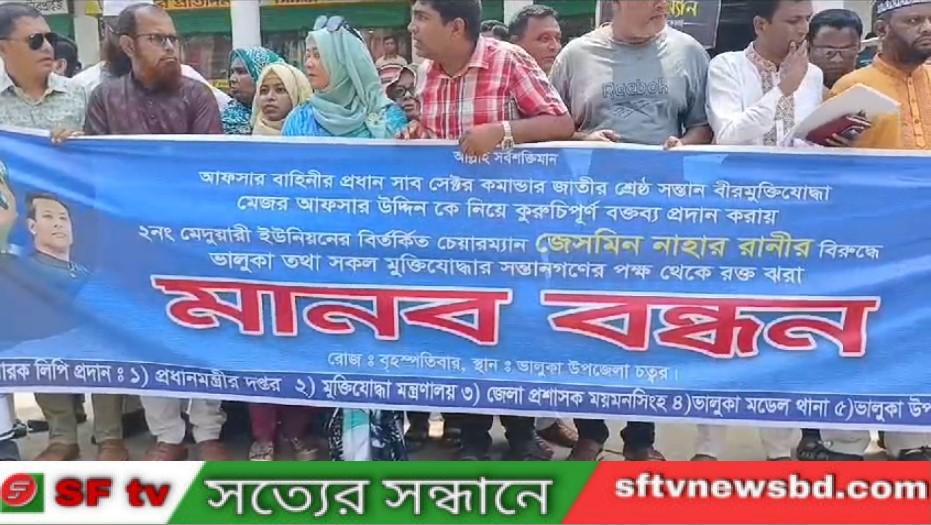 ভালুকা উপজেলার ২নং মেদুয়ারী ইউনিয়নের বিতর্কিত চেয়ারম্যান জেসমিন নাহার রানি কতৃক মুক্তিযুদ্ধের আফসার বাহিনীর প্রধান ১১নং সাব সেক্টর কমান্ডার কিন্বনন্তি বীর মুক্তি যোদ্ধা প্রয়াত মেজর আফসার উদ্দিন আহম্মেদ কে নিয়ে কুরুচিপূর্ণ বক্তব্য দেওয়ার প্রতিবাদে গতকাল বৃহস্পতিবার ৪ এপ্রিল সকালে ভালুকা গফরগাঁও সড়কে উপজেলা পরিষদের সামনে মানববন্ধন করেন বীর মুক্তিযোদ্ধা সন্তান কল্যাণ ট্রাষ্ট। মানব বন্ধনে অন্যান্যদের মাঝে বক্তব্য রাখেন উপজেলা যুবলীগের মহিলা বিষয়ক সন্পাদক মেজর কন্যা রহিমা আফরোজ শেফালি উপজেলা আওয়ামীলীগের সহ দফতর সন্পাদক আফতাবউদ্দিন আহম্মেদ মাহবুব মেদুয়ারী ইউনিয়ন কৃষকলীগ সাধারণ সম্পাদক ও মুক্তিযোদ্ধা সন্তান সংসদ ভালুকা উপজেলা শাখার যুগ্ম সাধারন সন্পাদক শামীম আহম্মেদ বীরমুক্তিযোদ্বা কল্যান ট্রাষ্টের সভাপতি মনিরুজ্জামান মনির সাধারণ সন্পাদক শেখ মোঃ জহির রায়হান সহসভাপতি বদরুল আলম প্রমুখ। মানববন্ধন শেষে উপজেলা নির্বাহী অফিসারের মাধ্যামে জনপ্রশাসন মন্ত্রণালয় বরাবর স্বারকলিপি প্রদান করা হয়। উল্লেখ্য ভালুকা উপজেলার ২নং ইউনিয়নের বিতর্কিত চেয়ারম্যান জেসমিন নাহার রানী পাবলিক মঞ্চে দাঁড়িয়ে বিভিন্ন ইলেকট্রনিক ও প্রিন্ট মিডিয়ার কর্মীদের সামনে বিশেষ ব্যক্তিদের উপস্থিতিতে বীর মুক্তিযোদ্ধা মেজর আফসার উদ্দিন আহমেদকে শুকর ও বাটপার বলে আখ্যায়িত করেন যা সোশ্যাল মিডিয়া ছড়িয়ে পড়লে সারা ভালুকায় বীর মুক্তিযোদ্ধা মুক্তিযোদ্ধাদের সন্তান ও সাধারণ মানুষের মাঝে তীব্র প্রতিক্রিয়া সৃষ্টি হয়।