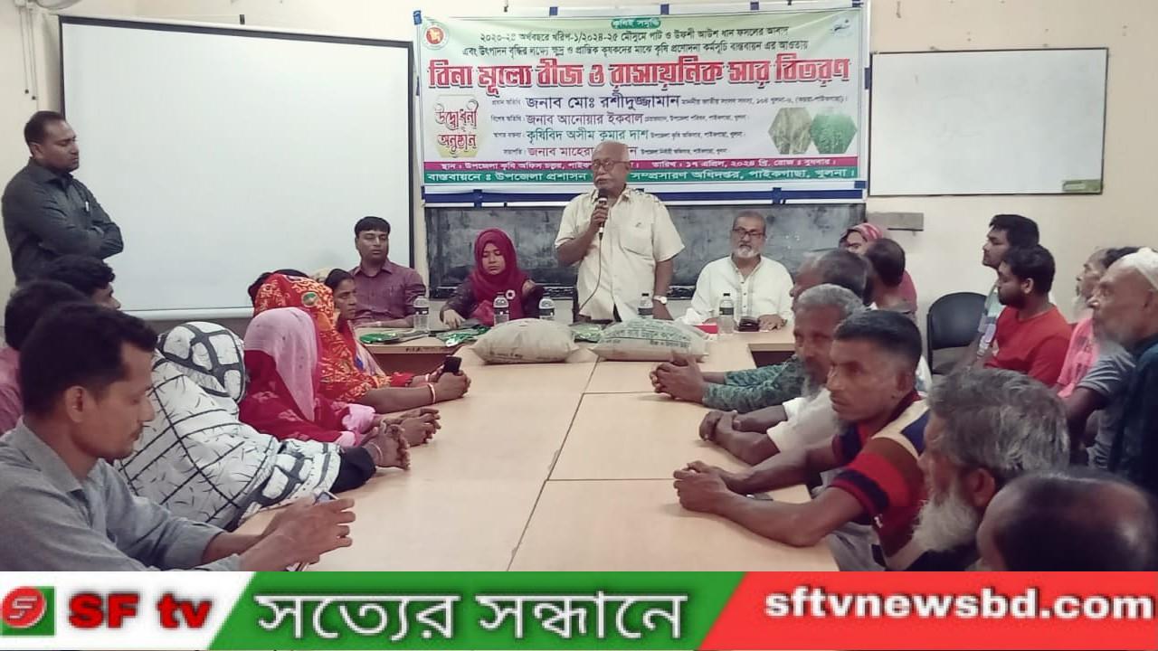 খুলনার পাইকগাছায় ২০২৩-২০২৪ অর্থবছরে খরিপ-১/২০২৪-২৫ মৌসুমে পাট ও উফশী আউশ ধান ফসল এবং উৎপাদন বৃদ্ধির লক্ষ্যে ক্ষুদ্র ও প্রান্তিক কৃষকদের মাঝে কৃষি প্রণোদনা কর্মসূচি বাস্তবায়ন এর আওতায় বিনা মূল্যে বীজ ও রাসায়নিক সার বিতরণ করা হয়েছে। অনুষ্ঠানে প্রধান অতিথি ছিলেন খুলনা-৬ সংসদ সদস্য মোঃ রশীদুজ্জামান। প্রধান অতিথির বক্তব্যে এমপি রশীদুজ্জামান বলেন, প্রধানমন্ত্রী শেখ হাসিনা অনেক গুনে গুণান্বিত, এরই অংশ হিসেবে কৃষি বিষয়ে তিনি সারা বাংলাদেশে ব্যাপক বিপ্লব ঘটিয়েছে। যার সুফল হিসেবে আপনারা বর্তমান সরকার কর্তৃক বিনা মূল্যে বীজ ও রাসায়নিক সার সহ কৃষি বিষয়ে বিভিন্ন সুযোগ সুবিধা পেয়ে থাকেন। বুধবার সকাল ১১ টায় উপজেলা কৃষি অফিস চত্বরে উপজেলা কৃষি অফিস কর্তৃক আয়োজিত সভায় সভাপতিত্ব করেন উপজেলা নির্বাহী অফিসার মাহেরা নাজনীন। উপজেলা কৃষি অফিসার ও কৃষিবীদ অসীম কুমার দাশ এর স্বাগত বক্তব্যর মধ্যে দিয়ে বিশেষ অতিথি ছিলেন, উপজেলা চেয়ারম্যান মোঃ আনোয়ার ইকবাল মন্টু, মহিলা ভাইসচেয়ারম্যান লিপিকা ঢালী। এসময়ে আরো উপস্থিত ছিলেন, জেলা ছাত্রলীগ নেতা মৃণাল কান্তি বাছাড়, প্রভাষক বাবলুর রহমান সহ বিভিন্ন পর্যায়ের নেতা কর্মী ও অফিস স্টাফ বৃন্দ।