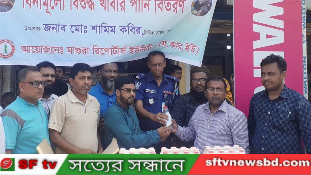 এলাকায় তীব্র গরমের মধ্যে জীবিকা নির্বাহে ব্যস্ত ৩শ পথচারী, অটোরিকশা ও রিকশাচালকদের মধ্যে বিশুদ্ধ ঠান্ডা পানি ও খাবার স্যালাইন বিতরণ করা হয়। এ সময় প্রধান অতিথি হিসেবে উপস্থিত থেকে বিশুদ্ধ পানি ও স্যালাইন বিতরণ কার্যক্রম উদ্বোধন করেন সিভিল সার্জন মোঃ শামীম কবির ।অন্যান্যদের মধ্যে উপস্থিত ছিলেন ইসলামী ফাউন্ডেশনের উপ পরিচালক মোঃ মনিরুজ্জামান, মাগুরা রিপোর্টার্স ইউনিটির সাধারণ সম্পাদক মোঃ ইউনুছ আলী, সহ-সভাপতি আলী আশরাফ, মাগুরা টিভি জার্নালিস্ট অ্যাসোসিয়েশনের সদস্য সচিব ও সময় টেলিভিশনের মাগুরা প্রতিনিধি শেখ ইলিয়াস মিথুন, দৈনিক আমার সময় এর মাগুরা প্রতিনিধি এস এফ টিভির স্টাফ রিপোর্টার মোঃ তৌহিদুল ইসলাম , সাংবাদিক মিজানুর রহমান, ফারুক আহমেদ, মনির হোসেন,রাজিব হোসেন, হুমায়ুন কবির , জিয়াউল কবির ,মাজেদুল ইসলামসহ অন্যান্য সাংবাদিক বৃন্দ।