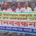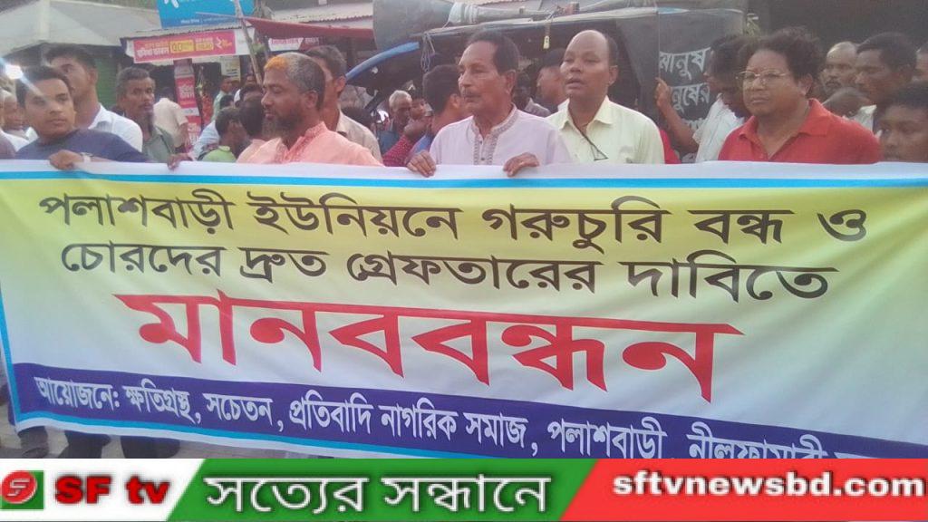 নীলফামারীর পলাশবাড়ীতে চুরির সংখ্যা উদ্বেগ জনক হারে বেড়ে যাওয়ায় চোরদের দ্রুত গ্রেপ্তার এবং গরু চুরি বন্ধ দাবিতে এক মানববন্ধন কর্মসূচি পালন করছে ক্ষতি গ্রস্হ, সচেতন, প্রতিবাদী নাগরিক সমাজ । মঙ্গলবার বিকেলে নীলফামারীর সদর উপজেলার পলাশবাড়ী বাজারে মানববন্ধন কর্মসূচি পালন করে। এসময় ক্ষতি গ্রস্হ উক্ত ইউনিয়ন সকল মানুষ মানববন্ধনে উপস্থিত হয়ে গরু চুরি সকল প্রকার চুরি বন্ধ এবং চোরদের দ্রুত গ্রেপ্তারের জোর দাবি করেন এসময় তারা বলেন সম্প্রতি কয়েক বছর ধরে পলাশবাড়ী ইউনিয়নে চুরির সংখ্যা উদ্বেগ জনক হারে বেড়ে গেছে যা আমাদের পাশ্ববর্তী টুপামারী, লক্ষীচাপ, খোকশাবাড়ি সহ কয়েকটি ইউনিয়নে নেই তবে আমাদের ইউনিয়নে এতো চুরি কেন , কে এই চোরদের তথ্য দাতা। তারা আরো বলেন প্রশাসন যদি আমাদের চুরি ঠেকাতে না পারে সেক্ষেত্রে আমাদের কে বলুক আমরা রাত জেগে পারা দেব, দেখবো কিভাবে চুরি হয় । এসময় মানববন্ধনের আহবায়ক পলাশবাড়ী ইউনিয়ন পরিষদের সাবেক চেয়ারম্যান এবং বাংলাদেশ আওয়ামী লীগের পলাশবাড়ী ইউনিয়ন শাখার সভাপতি মমতাজ আলী প্রামানিক বলেন আজকের এই মানববন্ধন কর্মসূচি পালন করার প্রধান কারন হচ্ছে চুরি বন্ধ করা আর চোরদের দ্রুত গ্রেপ্তারের দাবিতে প্রশাসন যদি কিছু করতে না পারে সেক্ষেত্রে আমরা এই এই মানববন্ধন কর্মসূচি পরবর্তীতে জেলায় গিয়ে করবো তবুও যদি প্রশাসন চোরদের দ্রুত গ্রেপ্তার করতে না পারে তাহলে আমরা আরো কঠোর থেকে কঠোর তম কর্মসূচী পালন করতে বাধ্য হব, আমি চাই আমার ইউনিয়নের মানুষ একটু শান্তিতে থাক , তাই আমার ইউনিয়ন বাসীকে শান্তিতে রাখতে যা করার দরকার আমি তাই করবো প্রয়োজনে রাত জেগে আমি আমার ইউনিয়নে পাহারা দিব তবুও আমার ইউনিয়নে চুরি বন্ধ করবো।