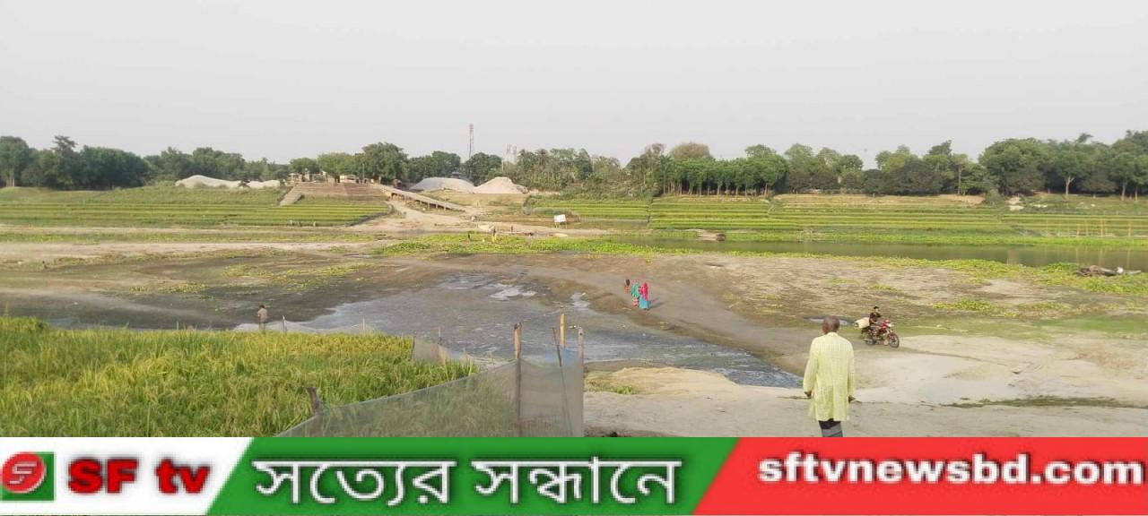 চাঁপাইনবাবগঞ্জে মহানন্দা নদীর মল্লিকপুর ঘাট পায়ে হেঁটে পার হচ্ছে