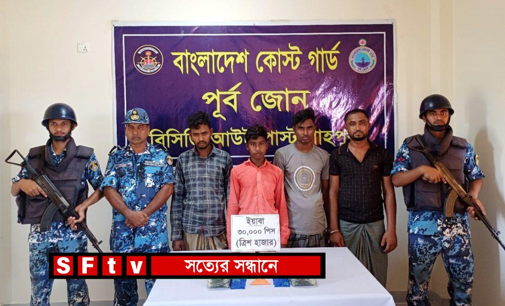আটককৃত মাদক ব্যবসায়ীরা হলেন,টেকনাফ উপজেলার বাহারছড়া ইউনিয়নের নোয়াখালী পাড়ার মোঃ রফিক (১৪), আবু তাহের (২০), মোঃ ইব্রাহিম (২৬) ও মোঃ ফারহান (২৪)।শনিবার (১৮ মে) দুপুরে কোস্ট গার্ড সদর দপ্তরের মিডিয়া কর্মকর্তা লেফটেন্যান্ট সিয়াম-উল-হক গণমাধ্যমকে এসব তথ্য নিশ্চিত করেন।তিনি বলেন,শনিবার (১৮ মে) ভোররাতে গোপন সংবাদের ভিত্তিতে বাংলাদেশ কোস্ট গার্ডের একটি দল টেকনাফ উপজেলার শাহপরীর দ্বীপ গোলাপাড়া ঝাউবন সংলগ্ন নাফ নদীর মোহনায় একটি বিশেষ অভিযান পরিচালনা করে। অভিযান চলাকালীন একটি ইঞ্জিন চালিত কাঠের বোটের গতিবিধি সন্দেহজনক মনে হলে কোস্ট গার্ডের আভিযানিক দল টর্চ ও বাঁশির মাধ্যমে বোটটিকে থামার সংকেত প্রদান করে। সন্দেহভাজন ব্যক্তিরা কোস্ট গার্ডের উপস্থিতি বুঝতে পেরে দ্রুত মায়ানমার জলসীমায় পালানোর চেষ্ঠা করলে কোস্ট গার্ডের আভিযানিক দল ধাওয়া করে বোটটি জব্দ করে। পরবর্তীতে বোটটি তল্লাশি করে ৩০ হাজার পিস ইয়াবা, ২ টি মোবাইল ফোন জব্দ করা হয় এবং ৪ জন মাদক ব্যবসায়ীকে আটক করা হয়। প্রাথমিক জিজ্ঞাসাবাদে তারা জানায় আটককৃতরা সবাই টেকনাফ উপজেলাধীন নোয়াখালী গ্রামের বাসিন্দা।