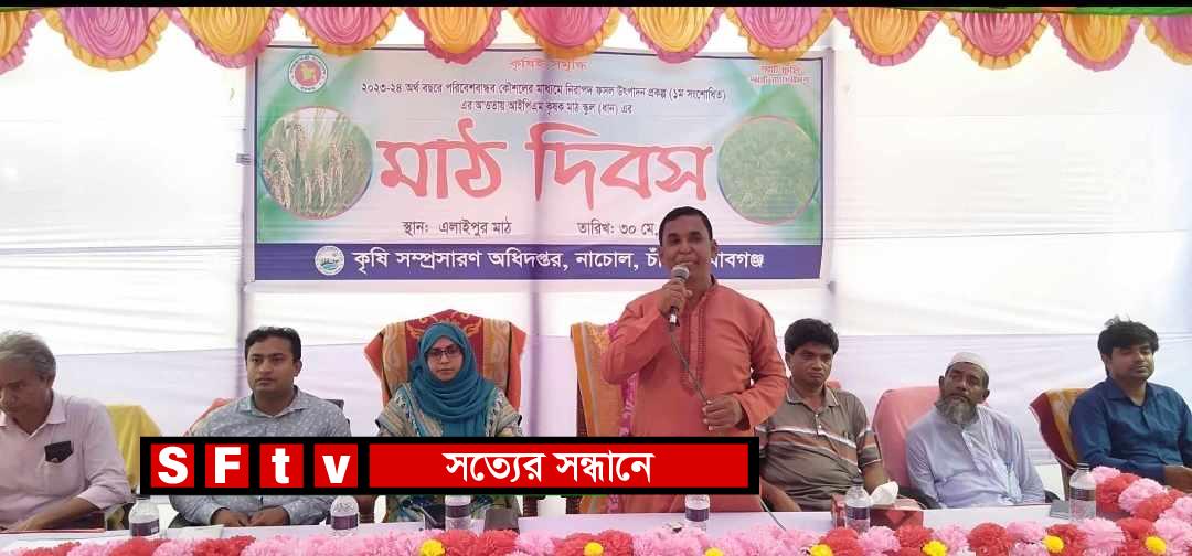 চাঁপাইনবাবগঞ্জের নাচোলে ২০২৩-২৪ ইং অর্থ বছরে পরিবেশ বান্ধব কৌশলের মাধ্যমে নিরাপদ ফসল উৎপাদন প্রকল্পের আওতায় বাস্তবায়িত কৃষক মাঠ স্কুলের মাঠ দিবস ও পুরস্কার বিতরণ অনুষ্ঠিত হয়েছে। গতকাল বৃহস্পতিবার বিকেলে নাচোল কৃষি সম্প্রসারণ অধিদপ্তরের আয়োজনে কসবা ইউনিয়নের এলাইপুর মাদ্রাসা মাঠে এ মাঠ দিবস অনুষ্ঠিত হয়। এসময় প্রশিক্ষণ প্রাপ্ত ২৫ জন কৃষক-কৃষাণীকে দুই হাজার আট’শ টাকা ও সার্টিফিকেট প্রদান করা হয়। এসময় নাচোল উপজেলা নির্বাহী অফিসার নীলুফা সরকারের সভাপতিত্বে, প্রধান অতিথির বক্তব্য রাখেন, তৃতীয় বারের সফল উপজেলা চেয়ারম্যান আব্দুল কাদের। বিশেষ অতিথির বক্তব্য রাখেন, উপজেলা কৃষি অফিসার সালেহ আকরাম, কসবা ইউনিয়নের চেয়ারম্যান জাকারিয়া আল-মেহরাব, বাইলকাপাড়া বদ্ধায়চন্ডীপুর আলিম মাদ্রাসার অধ্যক্ষ মাওলানা সোলাইমান। অনুষ্ঠান সঞ্চালনা করেন উপ-সহকারী উদ্ভিদ সংরক্ষণ অফিসার আব্দুর নুর, উপসহকারী কৃষি কর্মকর্তা রাকিবুল ইসলাম ও আমিনুল ইসলামসহ স্থানীয় গণ্যমান্য ব্যক্তিবর্গ ও ২৫ জন কৃষক- কৃষাণী প্রশিক্ষনার্থীসহ শতাধিক কৃষক-কৃষাণী উপস্থিত ছিলেন।