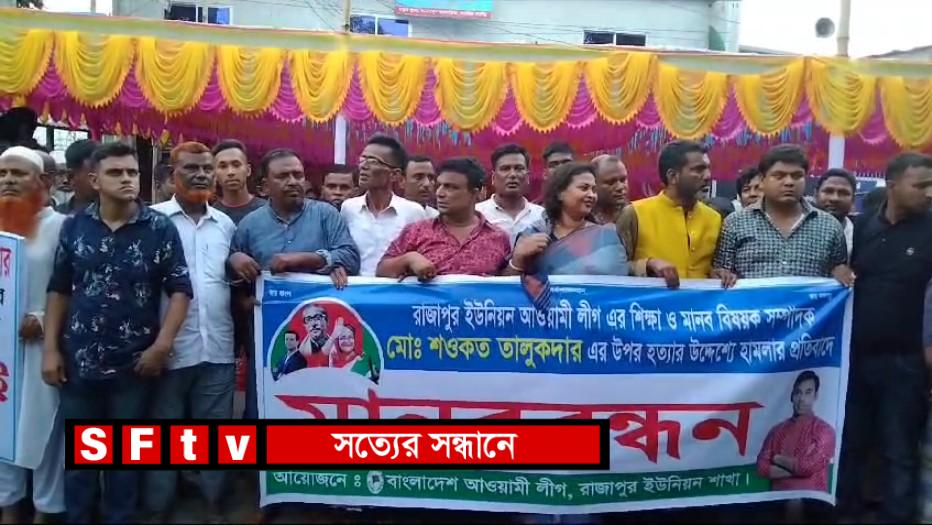 সিরাজগঞ্জের বেলকুচি উপজেলার ২ নং রাজাপুর ইউনিয়ন আওয়ামিলীগের মানব ও শিক্ষা বিষয়ক সম্পাদক মোঃ শওকত আলী তালুকদার এর উপর ৩১ শে মে শুক্রবার রাতে তাকে গুলি করে হত্যার উদ্যেশে হামলার প্রতিবাদে মানববন্ধন ও বিক্ষোভ মিছিল করেন রাজাপুর ইউনিয়ন আওয়ামিলীগ ও উপজেলা আওয়ামী লীগের নেতৃবৃন্দ।এসময় শওকত আলী কান্না জরিত কন্ঠে বলেন আমার জানামতে আমার কোন শত্রু নেই, তারপরও আমাকে গুলি করে হত্যার উদ্যেশে কয়েকজন মুখোশধারী সন্ত্রাসী আমার উপর অতর্কিত ভাবে হামলা চালায়, ভাগ্যক্রমে সেই গুলি আমার না লেগে কলেজ ছাত্র আল আমিন এর পায়ে লেগে মারাত্মক ভাবে আহত হয়ে হাসপাতালে চিকিৎসাধীন রয়েছে। তাই সন্ত্রাসী যেই হোক উপযুক্ত তদন্ত সাপেক্ষে তাদেরকে খুজে বের করে আইনের আওতায় এনে উপযুক্ত শাস্তি দাবি জানান।রবিবার বিকেলে ২রা জুন রাজাপুর ইউনিয়ন আওয়ামিলীগ এর দলীয় কার্যালয়ের সামনে রাজাপুর ইউনিয়ন আওয়ামিলীগ এর সহসভাপতি সাইফুল ইসলাম এর সভাপতিত্বে রাজাপুর ইউনিয়ন আওয়ামিলীগ এর সাধারণ সম্পাদক বদর তালুকদার এর সঞ্চালনায় বক্তব্য রাখেন বেলকুচি উপজেলা পরিষদের নবনির্বাচিত চেয়ারম্যান ইঞ্জিনিয়ার আমিনুল ইসলাম, বেলকুচি উপজেলা পরিষদের সাবেক চেয়ারম্যান ও উপজেলা আওয়ামীলীগের সাবেক সাংগঠনিক সম্পাদক মোহাম্মদ আলী আকন্দ, রাজাপুর ইউপি চেয়ারম্যান সনিয়া সবুর আকন্দ, সাবেক রাজাপুর ইউপি চেয়ারম্যান আতাউর রহমান, পৌর ছাত্রলীগের সভাপতি আকতার হামিদ সহ উপজেলা ও ইউনিয়ন আওয়ামিলীগের বিভিন্ন পর্যায়ের নেতৃবৃন্দ এসময় বক্তব্য রাখেন।
