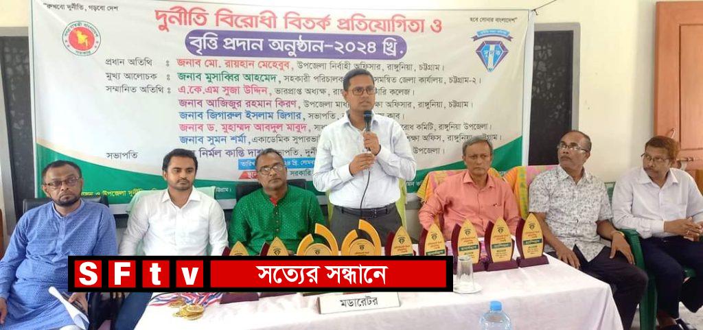দুর্নীতি প্রতিরোধ কমিটি চট্টগ্রামের রাঙ্গুনিয়া উপজেলার আয়োজনে দুর্নীতি বিরোধী বিতর্ক প্রতিযোগিতা ও বৃত্তি প্রদান অনুষ্ঠান রাঙ্গুনিয়া সরকারি কলেজ মিলনায়তনে সোমবার (৩ জুন) বিকেলে অনুষ্ঠিত হয়েছে। দুর্নীতি প্রতিরোধ কমিটি রাঙ্গুনিয়া উপজেলার সভাপতি নির্মল কান্তি দাশের সভাপতিত্বে অনুষ্ঠানে প্রধান অতিথি ছিলেন উপজেলা নির্বাহী কর্মকর্তা মো. রায়হান মেহেবুব। মূখ্য আলোচক ছিলেন দুদক সমন্বিত জেলা কার্যালয় চট্টগ্রাম ২ এর সহকারী পরিচালক মুসাব্বির আহমেদ।