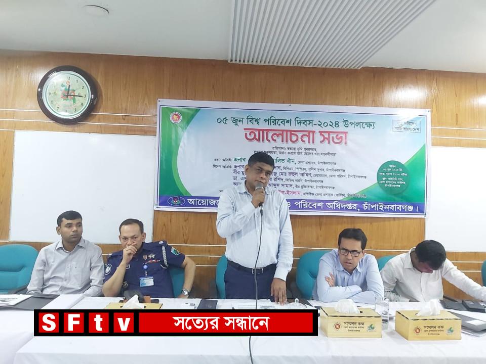 চাঁপাইনবাবগঞ্জে বিশ্ব পরিবেশ দিবস-২০২৪ পালিত হয়েছে। এ উপলক্ষে শোভাযাত্রা ও আলোচনা সভার আয়োজন করে জেলা প্রশাসন ও পরিবেশ অধিদপ্তর, চাঁপাইনবাবগঞ্জ।বুধবার বেলা ১১টায় জেলা প্রশাসকের কার্যালয়ের সামনে হতে একটি শোভাযাত্রা শুরু হয়ে জেলার গুরুত্বপূর্ণ সড়ক প্রদক্ষিণ শেষে একই স্থানে এসে শেষ হয়। শোভাযাত্রা শেষে জেলা প্রশাসকের কার্যালয়ের আইসিটি ল্যাবে আলোচনা সভা হয়। অতিরিক্ত জেলা প্রশাসক (সার্বিক) আহমেদ মাহবুব-উল-ইসলামের সভাপতিত্বে আলোচনা সভায় প্রধান অতিথি ছিলেন, জেলা প্রশাসক একেএম গালিভ খাঁন। ‘করবো ভুমি পুনরুদ্ধার, রুখবো মরুময়তা, অর্জন করতে হবে মোদের খরা সহনশীলতা’ প্রতিপাদ্যে আলোচনা সভায় বিশেষ অতিথি ছিলেন, অতিরিক্ত পুলিশ সুপার নুরুজ্জামান, জেলা প্রশাসনের সহকারী কমিশনার আমিনুল ইসলাম, বীর মুক্তিযোদ্ধা এ্যাড. আব্দুস সামাদসহ অন্যরা। বিশ্ব পরিবেশ দিবসের আলোচনা সভায় স্বাগত বক্তব্য রাখেন, পরিবেশ অধিদপ্তর, চাঁপাইনবাবগঞ্জের সহকারী পরিচালক মিজানুর রহমান।