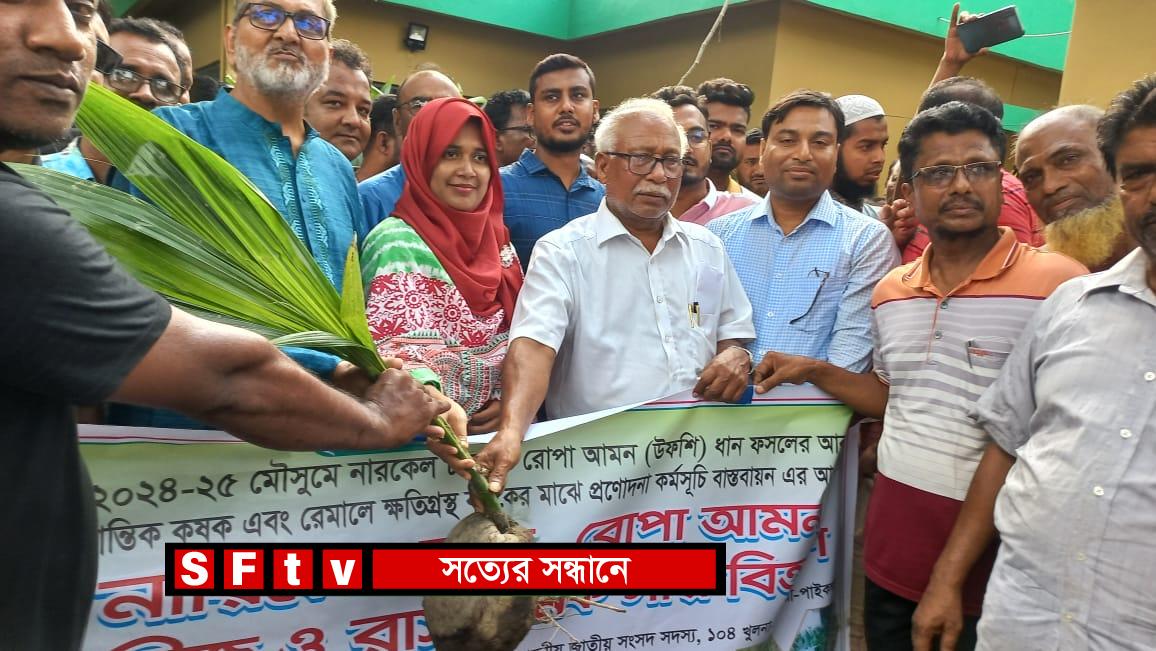 পাইকগাছায় ২০২৩-২৪ অর্থ বছরে খরিপ-২/ ২০২৪-২৫ মৌসুমে বিনামূল্যে দেশী জাতের নারিকেলের চারা ও রোপা আমন (উফশি) ধান ফসলের আবাদ এবং উৎপাদন বৃদ্ধির লক্ষ্যে প্রান্তিক ও ক্ষুদ্র কৃষক, রেমালে ক্ষতিগ্রস্থ কৃষকদের মাঝে কৃষি প্রণোদনা কর্মসূচির বাস্তবায়নের আওতায় বিনামূল্যে নারিকেলের চারা ও রোপা আমন (উফশি) ধান বীজ ও রাসায়নিক সার বিতরণ করা হয়েছে।
