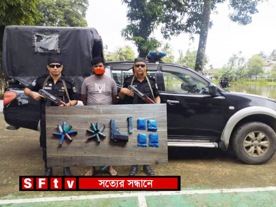 এরই ধারাবাহিকতায় কক্সবাজার জেলার উখিয়া থানার জিআর মামলা নং-১০/৪১৫, তারিখ-০৪/০৭/২০২৪, ১৮৭৮ সালের অস্ত্র আইনের ১৯(এ)/১৯(এফ) ধারা এবং ২০১৮ সালের মাদকদ্রব্য নিয়ন্ত্রণ আইন ১০(এ) এর ৩৬(১) ধারা মোতাবেক দায়েরকৃত মামলার এজাহারনামীয় আসামী আজিজুল হক’কে গ্রেফতারের লক্ষ্যে র্যাব-১৫, কক্সবাজার এর গোয়েন্দা তৎপরতা চলমান থাকে। উক্ত আসামী কক্সবাজারের উখিয়া থানাধীন ৮নং রোহিঙ্গা ক্যাম্পে মাদকদ্রব্য ইয়াবা ক্রয়-বিক্রয়ের উদ্দেশ্যে অবস্থান করছে মর্মে প্রাপ্ত গোপন সংবাদের ভিত্তিতে গত ০৩ জুলাই ২০২৪ তারিখ ১৫.১০ ঘটিকার সময় র্যাব-১৫, বিজিবি এবং ৮ ও ১৪ এপিবিএন কর্তৃক যৌথ অভিযান পরিচালনা করা হয়। অভিযান পরিচালনাকালে র্যাবের উপস্থিতি বুঝতে পেরে কৌশলে পলায়নের সময় মোঃ আজিজুল হক নামে এক মাদক কারবারীকে গ্রেফতার করতে সক্ষম হয়। পরবর্তীতে উপস্থিত স্বাক্ষীদের সম্মুখে গ্রেফতারকৃত আসামীর দেহ তল্লাশী করে সর্বমোট ০১টি বিদেশী পিস্তল, ১১ রাউন্ড তাজা কার্তুজ, ০৭ রাউন্ড কার্তুজের খোসা এবং ৬০০ পিস ইয়াবা উদ্ধার করা হয়।