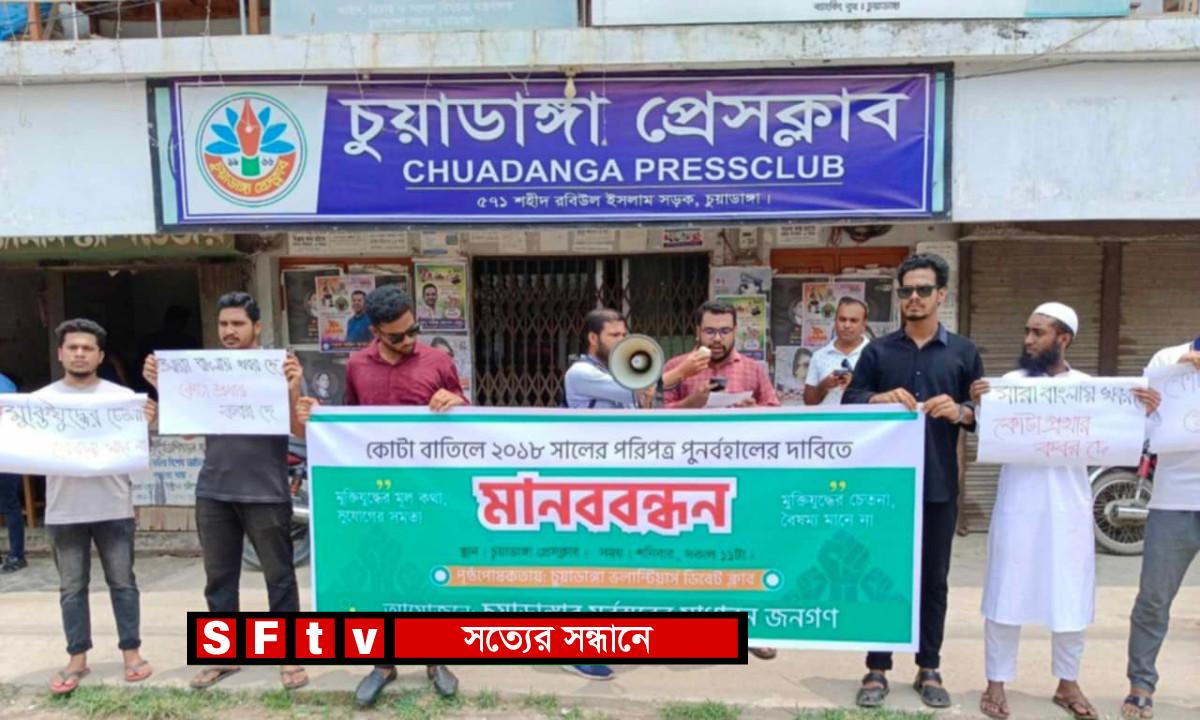 সরকারি চাকরিতে কোটা পদ্ধতি পুনর্বহাল সংক্রান্ত হাইকোর্টের রায়ের প্রতিবাদে মানববন্ধন করেছে চুয়াডাঙ্গার জনসাধারণ ও সাধারণ শিক্ষার্থীরা।