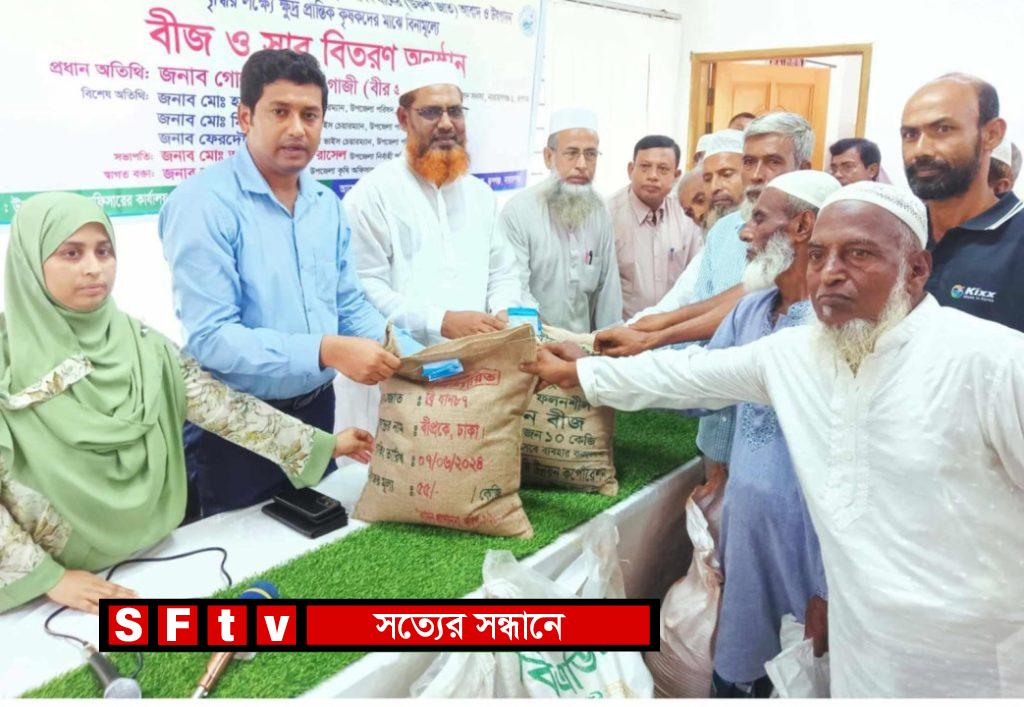 নারায়ণগঞ্জের রূপগঞ্জে ২০২৩-২৪ অর্থ বছরের (খরিপ-২) ২০২৪-২৫ মৌসুমে আমন ধানের (উফশী জাত) আবাদ ও উৎপাদন বৃদ্ধির লক্ষে ক্ষুদ্র প্রান্তিক কৃষকদের মাঝে বিনামূল্যে বীজ ও সার বিতরণ করা হয়েছে। গতকাল ৮ জুলাই রূপগঞ্জ উপজেলা কৃষি অফিস কার্যালয়ে এ সার ও বীজ বিতরণ করা হয়। এসময় প্রত্যেক কৃষককের মাঝে ব্রি ধান ৪৯, ৮৭ জাতের পাচ কেজি ধানের বীজ, ১০ কেজি বিএডিসি ও ১০ কেজি এমওপি সার তুলে দেওয়া হয়। আয়োজিত বিতরণীয় সভায় সভাপতিত্ব করেন রূপগঞ্জ উপজেলা নির্বাহী অফিসার আহসান মাহমুদ রাসেল। সভায় বক্তব্য রাখেন, রূপগঞ্জ উপজেলা পরিষদের চেয়ারম্যান মোঃ হাবিবুর রহমান, উপজেলা কৃষি অফিসার কৃষিবিদ আফরোজা সুলতানা, সহকারী কৃষি সম্প্রসারণ একেএম মোকসেদুল আবেদীন, উপ-সহকারী উদ্ভিদ সংরক্ষণ অফিসার মোঃ মোয়াজ্জেম হোসেন প্রমূখ। পরে কৃষকদের মাঝে সার ও বীজ তুলেদেন অতিথিবৃন্দরা।