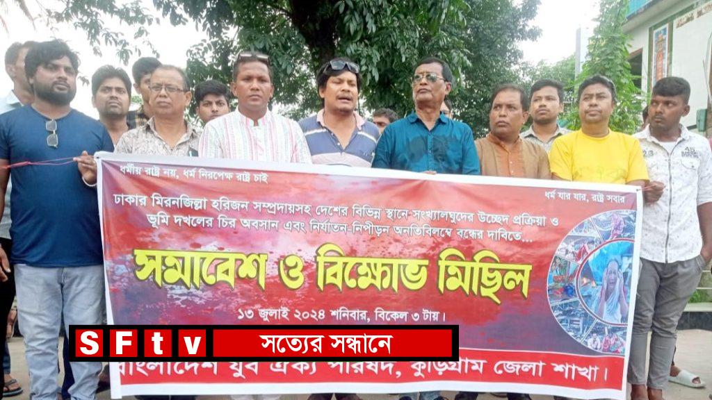 ঢাকায় মিরনজিল্লা হরিজন সম্প্রদায় সহ দেশের বিভিন্ন স্থানে সংখ্যালঘুদের উচ্ছেদ প্রক্রিয়া ও ভূমি দখলের চির অবসান এবং নির্যাতন-নিপীড়ন অনতিবিলম্বে বন্ধের দাবিতে কুড়িগ্রামে ১৩ জুলাই’২০২৪ইং শনিবার বিকেলে সমাবেশ ও বিক্ষোভ মিছিল অনুষ্ঠিত হয়েছে। বাংলাদেশ যুব ঐক্য পরিষদ, কুড়িগ্রাম জেলা শাখার ডাকে সমাবেশ ও বিক্ষোভ মিছিল কুড়িগ্রাম জেলা শহরের শাপলা চত্ত্বর থেকে শুরু করে প্রধান প্রধান সড়ক প্রদক্ষিণ শেষে শাপলা মোড়ে সমাবেশ অনুষ্ঠিত হয়। এ সমাবেশে বক্তব্য রাখেন- বাংলাদেশ হিন্দু, বৌদ্ধ, খৃষ্টান ঐক্য পরিষদ কুড়িগ্রাম জেলা শাখার সাধারণ সম্পাদক অলক সরকার, বাংলাদেশ যুব ঐক্য পরিষদের নারু গোপাল রায়, নিমাই চন্দ্র রায়, রতন রায়, সুজন রায়, জয়ন্ত কুমার রায় সহ বাংলাদেশ ছাত্র ঐক্য পরিষদ নেতৃবৃন্দ।