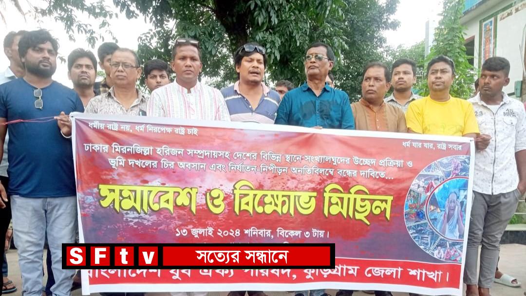 ঢাকায় মিরনজিল্লা হরিজন সম্প্রদায় সহ দেশের বিভিন্ন স্থানে সংখ্যালঘুদের উচ্ছেদ প্রক্রিয়া ও ভূমি দখলের চির অবসান এবং নির্যাতন-নিপীড়ন অনতিবিলম্বে বন্ধের দাবিতে কুড়িগ্রামে ১৩ জুলাই’২০২৪ইং শনিবার বিকেলে সমাবেশ ও বিক্ষোভ মিছিল অনুষ্ঠিত হয়েছে। বাংলাদেশ যুব ঐক্য পরিষদ, কুড়িগ্রাম জেলা শাখার ডাকে সমাবেশ ও বিক্ষোভ মিছিল কুড়িগ্রাম জেলা শহরের শাপলা চত্ত্বর থেকে শুরু করে প্রধান প্রধান সড়ক প্রদক্ষিণ শেষে শাপলা মোড়ে সমাবেশ অনুষ্ঠিত হয়। এ সমাবেশে বক্তব্য রাখেন- বাংলাদেশ হিন্দু, বৌদ্ধ, খৃষ্টান ঐক্য পরিষদ কুড়িগ্রাম জেলা শাখার সাধারণ সম্পাদক অলক সরকার, বাংলাদেশ যুব ঐক্য পরিষদের নারু গোপাল রায়, নিমাই চন্দ্র রায়, রতন রায়, সুজন রায়, জয়ন্ত কুমার রায় সহ বাংলাদেশ ছাত্র ঐক্য পরিষদ নেতৃবৃন্দ।