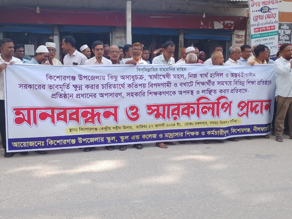 আজাদ হোসেন আওলাদ মিয়া,:নীলফামারীর কিশোরগঞ্জে শিক্ষকদের লাঞ্ছনার প্রতিবাদে মানববন্ধন করেছেন স্থানীয় শিক্ষকেরা। এতে প্রায় কয়েকশত শিক্ষক অংশগ্রহণ করেন। মঙ্গলবার( ২৭ আগস্ট) দুপুরে প্রেস ক্লাবের সামনে এ মানববন্ধন অনুষ্ঠিত হয়। এসময়ে বক্তরা বলেন, বর্তমান পরিস্থিতিতে কিছু অসাধু ও স্বার্থান্বেষী মহল শিক্ষকদের সম্মান নষ্ট করতে বিভিন্ন অপপ্রচার চালাচ্ছেন। তারা কোমলমতি শিক্ষার্থীদের ভুল বুঝিয়ে স্থানীয়দের দিয়ে মানববন্ধন ও বিক্ষোভ করছেন। এতে শিক্ষার্থীদের পাঠদান ব্যাহত হওয়ার পাশাপাশি প্রতিষ্ঠানের পরিবেশ নষ্ট হচ্ছে। শিক্ষকরা জাতির মেরুদন্ড তাদের এভাবে অসম্মান করা হচ্ছে আমরা সেটি মানতে পারছি না।অনেক শিক্ষক লাঞ্চণা সহ্য করতে না পেরে পদত্যাগ করেছে। যারা শিক্ষকদের পদত্যাগের মাধ্যমে দেশে অস্থিতিশীল পরিবেশ তৈরি করার চেষ্টা করছে তারা নৈতিকতা ও মানবিকতা বিরোধী।স্বার্থান্বেষী মহল শিক্ষকদের অসম্মান বন্ধ না করলে তারা ক্লাস বর্জনের সিদ্ধান্ত নিবেন। এতে উপজেলা মাধ্যমিক শিক্ষক সমিতির সভাপতি গোলাম আজমের সভাপতিত্বে কালিকাপুর স্কুল এন্ড কলেজের অধ্যক্ষ রেওদানুর রহমান, উত্তর দুরাকুটি উচ্চ বিদ্যালয়ের প্রধান শিক্ষক দুলাল মিয়া, শিশু নিকেতন স্কুল এন্ড কলেজের সহকারী শিক্ষক রুমান ফেরদৌসসহ বিভিন্ন স্কুল এন্ড কলেজের শিক্ষকরা উপস্থিত ছিলেন।