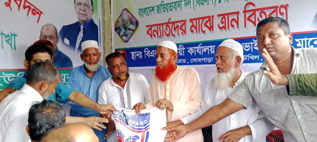 নোয়াখালীর চাটখিল উপজেলার বাংলাদেশ জাতিয়তাবাদী দল (বিএনপি) ১নং সাহাপুর ইউনিয়নের পক্ষ থেকে বন্যার্তদের মাঝে সাবেক এমপি জনাব ব্যারিষ্টার মাহাবুব উদ্দিন খোকন এর পরামর্শক্রমে, চাটখিল উপজেলা বিএনপির সাবেক যুগ্ম সাধারণ সম্পাদক, উপজেলা বিএনপির আহবায়ক কমিটির সদস্য জনাব শাহ্ জামাল এর নেতৃত্বে ত্রাণ বিতরণ করা হয়। এসময় প্রধান অতিথি হিসেবে উপস্থিত ছিলেন জনাব শাহ্ জামাল সাহেব, বিশেষ অতিথি হিসেবে উপস্থিত ছিলেন উপজেলা যুবদলের যুগ্ম আহবায়ক জনাব ফজলে আজিম আরজু, উপজেলা কৃষক দলের সাংগঠনিক সম্পাদক হোসেন আহম্মেদ ভূঁইয়া, উপজেলা যুবদল নেতা, ইউনিয়ন যুবদলের সদস্য সচিব জনাব ইসমাইল হোসেন ইয়াসিন, ইউনিয়ন বিএনপির নেতা সফিউল আলম মাহিন, আবুল হোসেন মেম্বার, এসময় সভাপ্রতিত্ব করেন ইউনিয়ন বিএনপির সাবেক সিঃ সহ সভাপতি, জনাব মনির আহম্মেদ, আরো বিশেষ অতিথি হিসেবে উপস্থিত ছিলেন সোমপাড়া কেন্দ্রীয় জামে মসজিদের সাধারণ সম্পাদক জনাব নুরুল হক, জনাব শেখ তাফাজুল হোসেন, নুরুল ইসলাম খাঁন,বিশিষ্ট ব্যাবসায়ী জনাব প্রীতি লাল দে, ডাঃ নিজাম মোঃ কাউছার, শফিউল আলম মাহিন হোসেন আহম্মেদ ভূঁইয়া, ওমর ফারুক শাহরিয়ান মাসুদ সহ বিভিন্ন নেতৃবৃন্দ, প্রধান অতিথি জনাব শাহ্ জামাল সাহেব নেতাকর্মীদের সকলকে ঐক্যবদ্ধ হয়ে বন্যায় ক্ষতিগ্রস্থ মানুষের পাশে থাকার আহবান জানান, এবং বন্যা শেষে এলাকায় যে সকল অসহায় মানুষের বাড়িঘর ক্ষতিগ্রস্থ হয়েছে তাদের পাশে থাকার অঙ্গিকার ব্যাক্ত করেন এবং বাজার ব্যাবসায়ীদের সকল চাঁদাবাজির হাত থেকে মুক্ত রাখতে সবসময় ইউনিয়ন বিএনপির সকল অঙ্গসংগঠনের নেতাকর্মীরা সংক্রিয় আছে বলে জানান।