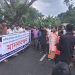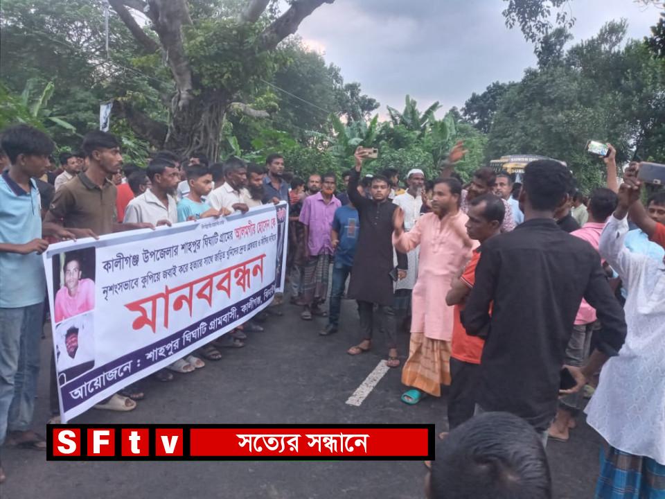 মাহাবুবুর রহমান: ঝিনাইদহের কালীগঞ্জ উপজেলার ত্রিলোচনপুর ইউনিয়নে শাহপুর ঘিঘাটি গ্রাম বাসির আয়োজনে আলমগীর হোসেন হত্যা মামলার আসামীদের গ্রেপ্তার ও ফাঁসির দাবিতে এক মানববন্ধনের অনুষ্ঠিত হয়েছে। বুধবার বিকালে কালীগঞ্জ- চুয়াডাঙ্গা মহা সড়কে ঘন্টা ব্যাপি এ মানববন্ধন অনুষ্ঠিত হয়। উল্লেখ্য, বিগত ৬ জুলাই বিকালে মাঠে ঘাস কাটতে গেলে সন্ত্রাসীরা তাকে কুপিয়ে ও গলা কেটে হত্যা করে। মানববন্ধনে বক্তব্য রাখেন নিহত আলমগীর হোসেনের স্ত্রী স্বপ্না খাতুন, মেয়ে আখি, সাবেক মেম্বর শহিদুল ইসলাম ও আমির হোসেন। মেয়ে আখি বলেন, আমার বাবা খুব নিরিহ একজন কৃষক ছিল তাকে এইভাবে হত্যা করল আমি এর বিচার চাই। নিহতের স্ত্রী এসময় কান্নায় ভেঙে পড়েন। কান্না জড়িত কন্ঠে বলেন, আমার স্বামীর হত্যাকারীদের ফাঁসি চাই।