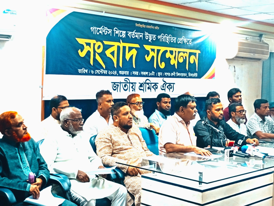 সুরুজ্জামান রাসেল: ঢাকা রিপোর্টার্স ইউনিটির সাগর-রুনী মিলনায়তনে শ্রমিক ঐক্যের সভাপতি এ এ এম ফয়েজ হোসেনের সভাপতিত্বে গার্মেন্টস শিল্পের বর্তমান পরিস্থিতি ও স্বৈরাচার সরকার পতনের একমাস পুর্তি উপলক্ষে শুক্রবার (৬ সেপ্টেম্বর) সকালে সংবাদ সম্মেলন ও আলোচনা সভা অনুষ্ঠিত হয়। উক্ত সভায় সঞ্চালনা ও দিক নির্দেশনা মূলক বক্তব্য রাখেন ঐক্যের সাধারণ সম্পাদক এডভোকেট আতিকুর রহমান। তিনি বলেন, স্বৈরাচারী শেখ হাসিনা পতনে বৈষম্য বিরোধী ছাত্র আন্দোলনরত অবস্থায় যারা জীবন উৎসর্গ করেছেন তাদেরকে গভীর শ্রদ্ধার সাথে স্মরণ করছি। গভীর শ্রদ্ধার সাথে আরও স্মরণ করছি শহিদ আবু সাঈদ ও গার্মেন্টস কর্মী আব্দুল আজিজসহ এ আন্দোলনে শাহাদাত বরণকারী অসংখ্য ছাত্র-জনতাকে। আহতদের দ্রুত সুস্থতা কামনা ও সুচিকিৎসা নিশ্চিতের দাবিসহ শহিদ ও পঙ্গুত্বদের পরিবারকে উপযুক্ত ক্ষতিপূরণ দেওয়ার জন্য সরকারের নিকট জোর দাবি জানাচ্ছি।স্বৈরাচার সরকারের পতনের আজ এক মাস অতিক্রান্ত হলেও স্বৈরাচার সরকারের দোসররা ক্ষমতা ফিরে পেতে ব্যাকুল হয়ে উঠেছে। তারা জুডিশিয়াল ক্যু, সনাতন ধর্মালম্বীদের উসকে দিয়ে অরাজকতা সৃষ্টির পায়তারা, আনসার বিদ্রোহসহ বিভিন্ন ইস্যু সৃষ্টি করে ছাত্র-জনতার বিপ্লবকে প্রতি বিপ্লবে রূপ দেওয়ার নানামুখী ষড়যন্ত্রে মেতে উঠেছে। এই স্বৈরাচারের সরকারের দোসররা তাদের কুচক্রী পরিকল্পনা বাস্তবায়িত করতে না পেয়ে তারা এখন দেশের রপ্তানী আয়ের প্রধান সেক্টর পোশাক শিল্পের উপর ভর করেছে। পোশাক শিল্প এই মুহূর্তে বাংলাদেশের অর্থনীতির প্রাণশক্তি। রপ্তানি আয়ের ৮৪ শতাংশ আসে এই খাত থেকে। জিডিপিতে পোশাক শিল্পের অবদান প্রায় ১১ ভাগ। পোশাক শিল্পে প্রায় ৪৪ লাখ শ্রমিক সরাসরি সম্পৃক্ত যার মধ্যে ৬০ শতাংশ নারী শ্রমিক এবং পোশাক শিল্পকে কেন্দ্র করে গড়ে উঠা অন্যান্য বাণিজ্য মিলিয়ে প্রায় ৩ কোটি মানুষের জীবিকা নির্ভর করছে এই খাতের উপর। এক সময় পোশাক শিল্প ছিল ১ মিলিয়ন ডলারের শিল্প। যা আজকে দাঁড়িয়েছে ৪৬ মিলিয়নে। বাংলাদেশ এখন বিশ্বের চীনের পর দ্বিতীয় বৃহত্তম তৈরি পোশাক রপ্তানী কারক দেশ। অর্থনীতিবান্ধব এ শিল্প আরেকটু পরিকল্পিতভাবে গোছানো সম্ভব হলে খুব তাড়াতাড়ি আমেরিকা ও ইউরোপের বাজারে শীর্ষস্থান দখল করবে। গার্মেন্টস শিল্পের শ্রমিকরা প্রতিনিয়ত জুলুমের শিকার হচ্ছে। বছরের পর বছর তাদের বেতন ভাতা নামকাওয়াস্তে বাড়ানো হচ্ছে। শ্রমিকরা তাদের ন্যায্য দাবি নিয়ে কথা বলতে গেলে বিগত স্বৈরাচার সরকারের সময় তাদের উপর পুলিশ ও দলীয় ক্যাডারদের লেলিয়ে দিয়ে সকল আন্দোলনকে প্রতিহত করার অপচেষ্টা করা হয়েছে। বিগত দেড় দশকে গার্মেন্টস শ্রমিকের মজুরি যৎসামান্য বেড়েছে। করোনা মহ