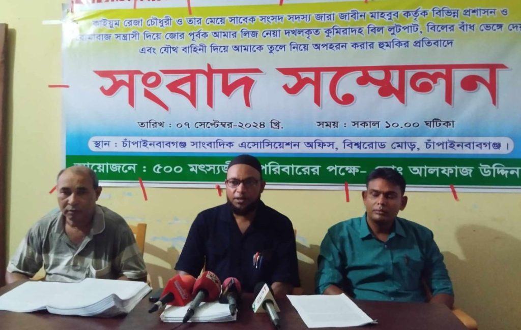 মাহিদুল ইসলাম ফরহাদ : বঙ্গবন্ধু শেখ মুজিবুর রহমানের সাবেক সহকারী প্রেস সচিব কাইয়ুম রেজা চৌধুরী এবং তার মেয়ে চাঁপাইনবাবগঞ্জের সংরক্ষিত নারী আসনের সাবেক সংসদ সদস্য ও জেলা আওয়ামী লীগের সদস্য জারা জাবীন মাহবুবের বিরুদ্ধে বিল দখল, চাঁদাবাজি, অর্থ আত্মসাৎ, লুটপাট যৌথ বাহিনী দিয়ে তুলে নিয়ে অপহরণ ও মিথ্যা মামলা দিয়ে হয়রানি হুমকির অভিযোগ সংবাদ সম্মেলন করেছেন মৎস্যজীবীরা৷ শনিবার (০৭ সেপ্টেম্বর) দুপুরে জেলা শহরের বিশ্বরোড় মোড়ের চাঁপাইনবাবগঞ্জ সাংবাদিক এসোসিয়েশনের অফিসে কমিরাদহ বিলের ৫০০ মৎস্যজীবী পরিবারের ব্যানারে আয়োজিত সংবাদ সম্মেলনে এসব অভিযোগ করেন মৎস্যজীবীরা। সংবাদ সম্মেলনে মৎস্যজীবীদের পক্ষে লিখিত বক্তব্য পাঠ করেন কুমিরাদহ বিলের ইজারাদার মো. আলফাজ উদ্দিন৷ এসময় তিনি বলেন, নিয়ম মাফিক চৌধুরী ইসমাইল সাজ্জাদ জোয়াদ ওয়াকফ এস্টেটের মোতাওয়াল্লী ও সাবেক এমপি জারা জাবীন মাহবুবের বাবা কাইয়ুম রেজা চৌধুরীর নিকট কাছ থেকে কুমিরাদহ বিল ইজারা নেওয়া হয়। কিন্তু এমপি জারা তার লোকজনের মাধ্যমে ৩০ লাখ টাকা চাঁদা দাবি করে। চাঁদা দিতে অস্বীকৃতি জানালে এমপি নিজে উপস্থিত থেকে বিলের ধারে থাকা মাছের খাবার ও বিভিন্ন সরঞ্জাম লুটপাট করেছে৷ মৎস্যজীবীরা আরও বলেন, একাধিক মিথ্যা মামলা দিয়ে হয়রানি করছে সাবেক এমপি জারা৷ এমনকি মাদক মামলা দিয়ে ও যৌথ বাহিনীর মাধ্যমে আটকের হুমকি দিয়ে বিল দখলের পায়তারা করছে আ.লীগ নেতা কাইয়ুম রেজা চৌধুরী ও তার লোকজন। এছাড়াও বিলের বাঁধ ভেঙে মাছ লুটপাট করার চেষ্টা করছে তারা। এনিয়ে প্রায় ৫০০ মৎস্যজীবী পরিবার বিনিয়োগ করা আড়াই কোটি টাকা হারানোর আশঙ্কায় রয়েছে। এমনি বিভিন্ন হুমকি-ধামকিতে বর্তমানে নিরাপত্তাহীনতায় রয়েছে মৎস্যজীবীরা। বিলের ইজারাদার আলফাজ উদ্দিন বলেন, সাবেক সরকারের শাসনামলে ভারতীয় গোয়েন্দা সংস্থা ‘র’ এর এজেন্ট হিসেবে কাজ করেছে জেলা আওয়ামী লীগের সাবেক সহ-সভাপতি কাইয়ুম রেজা চৌধুরী। তার এই কাজ এখনও চলমান রয়েছে। বর্তমানেও দেশের বিরুদ্ধে নানারকম ষড়যন্ত্র করছে তিনি ও তার পরিবার। গত কয়েকদিন ধরেই আদালতের মাধ্যমে না পেরে আইন-শৃঙ্খলা বাহিনীর মাধ্যমে বাড়ির মধ্যে ও আশেপাশে মাদক রেখে মৎস্যজীবীদের ধরিয়ে দেয়ার নাটক শুরু করেছেন কাইয়ুম রেজা চৌধুরী। সাবেক সরকারের শাসনামলে কয়েকজন শীর্ষ মন্ত্রী ও এমপির সাথে যোগসাজশে প্রভাব খাটিয়ে বিল দখলের পায়তারা শুরু করেন তিনি। আলফাজ উদ্দিন আরও বলেন, কুমিরাদহ বিল ছাড়াও আমরা ৫০০ জেলে পরিবার কায়েম রেজা চৌধুরীর কাছে ১০ কোটি ৯০ লাখ ৭১ হাজার ২১২ টাকা পাওনা রয়েছে, যা তার বাড়ীর দফাদার রবু, কেয়ারটেকার খাইরুল ইসলাম খায়ের, ও তার প্রধান হিসাব রক্ষক মোজাম
