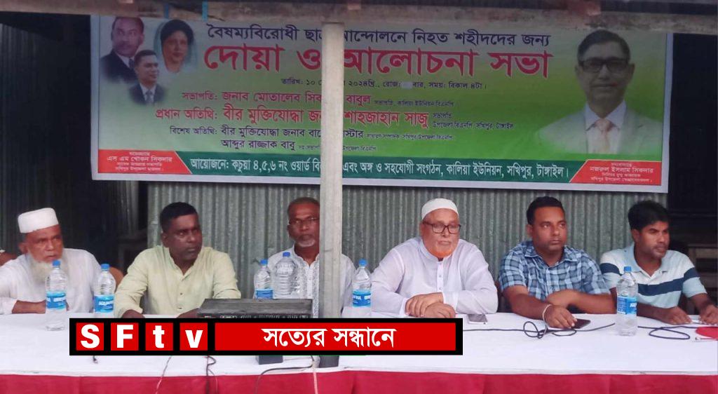 খাঁন আহম্মেদ হৃদয় পাশা: সখীপুর(টাঙ্গাইল)প্রতিনিধি: টাঙ্গাইলের সখীপুরে বৈষম্যবিরোধী ছাত্র আন্দোলনে নিহত শহীদদের জন্য দোয়া ও আলোচনা সভা অনুষ্ঠিত হয়েছে। মঙ্গলবার(১০ সেপ্টেম্বর) বিকেলে উপজেলার কচুয়া লিটল ফ্লাওয়ার প্রি-ক্যাডেট স্কুল প্রাঙ্গনে এ দোয়া ও আলোচনা সভা অনুষ্ঠিত হয়। কচুয়া ৪,৫,৬ নং ওয়ার্ড বিএনপি এবং কালিয়া ইউনিয়নের অঙ্গ সহযোগী সংগঠনের আয়োজনে অনুষ্ঠিত দোয়া ও আলোচনা সভায় কালিয়া ইউনিয়ন বিএনপির সভাপতি মোতালেব সিকদার বাবুলের সভাপতিত্বে প্রধান অতিথি হিসেবে বক্তব্য রাখেন সখীপুর উপজেলা বিএনপির সভাপতি বীর মুক্তিযোদ্ধা শাহজাহান সাজু। এছাড়াও আরো উপস্থিত ছিলেন সখীপুর উপজেলা বিএনপির সাধারণ সম্পাদক বীর মুক্তিযোদ্ধা বাছেদ মাস্টার, উপজেলা বিএনপির সহ-সভাপতি আব্দুর রাজ্জাক বাবু, উপজেলা যুবদলের সদস্য সচিব নাসির উদ্দিন, উপজেলা স্বেচ্ছাসেবকদলের সভাপতি তানভীর আহমেদ শহীদ, স্বেচ্ছাসেবকদলের সিনিয়র যুগ্ম আহবায়ক নজরুল ইসলাম সিকদার, উপজেলা ছাত্রদলের সাবেক ভারপ্রাপ্ত সভাপতি এস এম খোকন সিকদার প্রমুখ।