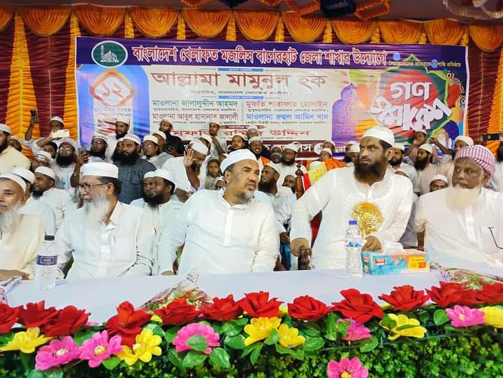 তরিকুল মোল্লা, বাগেরহাট প্রতিনিধি: বাংলাদেশ খেলাফত মজলিস বাগেরহাট জেলা শাখার উদ্যোগে বৃহস্পতিবার (১২ সেপ্টেম্বর) বিকালে জেলা পরিষদ অডিটোরিয়ামে এক মহাসমাবেশে প্রধান অতিথি হিসেবে বাংলাদেশ খেলাফত মজলিসের মহাসচিব মাওলানা মামুনুল হক বলেছেন, ৫ আগস্ট একটি সংগ্রামের মধ্য দিয়ে নতুন বাংলাদেশ গড়ার স্বপ্ন সকলের চোখে ভেসে উঠেছে। ছাত্র সমাজ ও আলেম সমাজকে আগামীর বাংলাদেশ বিনির্মাণে গুরুত্বপূর্ণ ভূমিকা পালন করতে হবে। সকল ইসলামী দলগুলো ঐক্যবদ্ধ হয়ে ন্যায় ও ইনসাফ পূর্ণ রাষ্ট্র প্রতিষ্ঠা করতে হবে। এজন্য ছাত্র সমাজ ও আলেম ওলামাদের আরো বেশি সচেতন হতে হবে, যাতে কেউ ঐক্য বিনষ্ট করতে না পারে। তিনি আরো বলেন, এ দেশ মুসলমান, হিন্দু, বৌদ্ধ ও খ্রিস্টানসহ ধর্ম বর্ণ নির্বিশেষে সকলের। তাই আমাদের সাম্প্রদায়িক সম্প্রীতি বাস্তবায়ন করতে হবে। বাংলাদেশের আলেম সমাজ, ইমাম সমাজ, ধর্ম প্রিয় মানুষ হিন্দু বুদ্ধ ও খ্রিস্টানদের ধর্মীয় উপাসনালয় যেভাবে পাহারা দিয়েছে। আমরা আগামী দিনেও এই দেশে সম্প্রীতির অনন্য দৃষ্টান্ত ধরে রাখবো। হিন্দুদের পূজাকে সামনে রেখে যাতে কেউ নৈরাজ্য সৃষ্টি না করতে পারে সে ব্যাপারে খেলাফত মজলিস, হেফাজতে ইসলামসহ সব ইসলামি দলকে সজাগ দৃষ্টি রাখতে হবে। হিন্দুদের কোন মুর্তিতে কেউ হাত দেয়ার চেষ্টা করলে সেই হাত ভেঙ্গে দেয়া হবে। হিন্দু ভাইয়েদের বলেন, আপনারা যত খুশি মূর্তি বানান আমরা আপনাদের মূর্তি পাহারা দেব। আমরা আর বিভাজন চাই না, আমরা সবাই মিলে একটি বৈষম্যহীন রাষ্ট্র প্রতিষ্ঠা করবো। সেখানে সব ধর্মের লোক সমান অধিকার ভোগ করবে। বাংলাদেশ খেলাফত মজলিস বাগেরহাট জেলা শাখার সভাপতি মুফতি রমিজ উদ্দিনের সভাপতিত্বে কেন্দ্রীয় কমিটির যুগ্ম মহাসচিব মাওলানা জালাল উদ্দিন আহমেদ, যুগ্ম মহাসচিব মুফতি শারাফাত হোসাইন, সাংগঠনিক সম্পাদক আবুল হাসনাত জালালী, কেন্দ্রীয় কমিটির সদস্য মাওলানা রুহুল আমিন খানসহ খেলাফত মজলিসের বিভিন্ন পর্যায়ের নেতাকর্মী বক্তব্য রাখেন। এ সময় অন্যান্যের মধ্যে আলেম-ওলামা, প্রিন্ট ও ইলেকট্রনিক মিডিয়ার সাংবাদিকসহ বিভিন্ন শ্রেণি-পেশার মানুষ উপস্থিত ছিলেন।