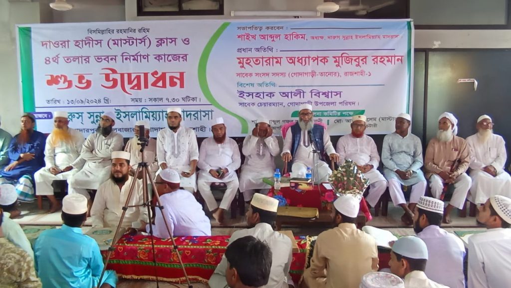 মোঃ রবিউল ইসলাম মিনাল: রাজশাহীর গোদাগাড়ীতে রেলবাজার দারুস সুন্নাহ মাদরাসার দাওরায়ে হাদীস ক্লাসের উদ্বোধন করা হয়েছে। ১৩ সেপ্টেম্বর (শুক্রবার) সকাল ৯ টার সময় গোদাগাড়ী উপজেলার রেলবাজার দারুস সুন্নাহ ইসলামিয়া মাদরাসার দাওরায়ে হাদীস ও চতুর্থ তলার ভবন নির্মাণ কাজের উদ্বোধন করা হয়। অনুষ্ঠানে শাইখ আব্দুল হাকিমের সভাপতিত্বে প্রধান অতিথি হিসেবে উপস্থিত ছিলেন বাংলাদেশ জামায়াতে ইসলামীর কেন্দ্রীয় কমিটির নায়েবে আমীর ও সাবেক সাংসদ অধ্যাপক মুজিবুর রহমান। অনুষ্ঠানে অন্যান্যের মধ্যে উপস্থিত ছিলেন সাবেক উপজেলা চেয়ারম্যান ইসহাক আলী বিশ্বাস, রাজশাহী জেলা পশ্চিম আমীর অধ্যাপক আব্দুল খালেক, সাবেক ভাইস চেয়ারম্যান ও পশ্চিম রাজশাহী জেলার সহ সেক্রেটারী কামরুজ্জামান, জেলা সহ সেক্রেটারী ড. ওবায়দুল্লাহ, গোদাগাড়ী পৌর জামায়াত আমীর মোঃ আনারুল ইসলাম, অত্র মাদরাসার উপাধ্যক্ষ মজিবুর রহমান, ভারপ্রাপ্ত সভাপতি আব্দুল গফুর আল মাদানী প্রমুখ। অধ্যাপক মুজিবুর রহমান অত্র মাদরাসার দাওরায়ে হাদীসের বোখারী শরিফের প্রথম হাদীস “সমস্ত কাজই নিয়তের উপর নির্ভর করে” এর ব্যাখ্যা এবং শেষ হাদীসের আলোচনা ব্যক্ত করেন। সেই সাথে সকলকে দ্বীনের উপর অবিচল থাকার জন্য আহ্বান করেন।
