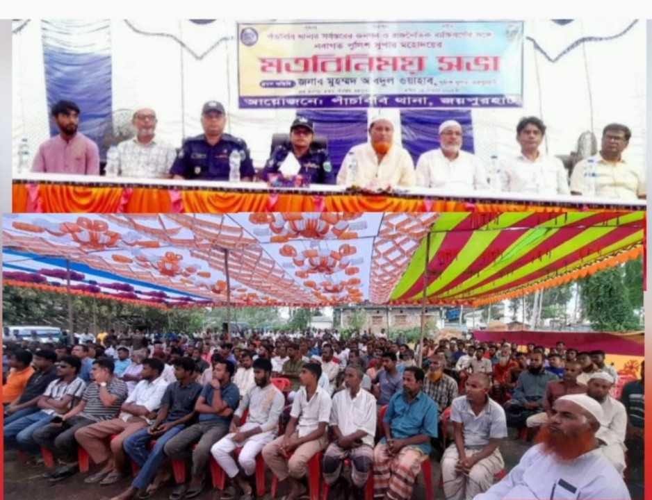 মোঃ আল আমিন : জয়পুরহাটের পাঁচবিবি থানা সর্বস্তরের জনগণ ও রাজনৈতিক ব্যাক্তিবর্গদের সঙ্গে নবাগত পুলিশ সুপার মহোদয়ের মত বিনিময় অনুষ্ঠিত হয়। ১৪ সেপ্টেম্বর ( শনিবার) পাঁচবিবি থানার আয়োজনে আওলাই ইউনিয়নের দায়িত্ব প্রাপ্ত বিট অফিসার এসআই আব্দুল্লাহ আল মাছুম ও এএসআই সোহেল রানা সহযোগীতায় চাঁনপাড়া বাজারে মতবিনিময় সভা অনুষ্ঠানে পাঁচবিবি থানার অফিসার ইনচার্জ ফয়সাল বিন আহসানের সভাপতিত্বে পাঁচবিবি থানার সহকারী পরিদর্শক (এসআই) শ্রী সুশান্ত কুমারের সঞ্চালনায় উক্ত অনুষ্ঠানে প্রধান অতিথি হিসেবে বক্তব্য রাখেন জয়পুরহাটের নবাগত পুলিশ জনাব মোহাম্মদ আবদুল ওয়াহাব। আরো বক্তব্য রাখেন পাঁচবিবি উপজেলা বিএনপির সভাপতি আলহাজ্ব সাইফুল ইসলাম ডালিম,উপজেলা বিএনপি সেক্রেটারী আব্দুল হান্নান চৌধুরী, আওলাই ইউনিয়ন বিএনপি সভাপতি মোজাহার আলী,কুসম্বা ইউনিয়ন বিএনপির সভাপতি মোস্তাফিজ রহমান ফিজু ,ধরঞ্জী ইউনিয়ন বিএনপি সভাপতি আব্দুল হাকিম মন্ডল, আওলাই ইউনিয়ন বাংলাদেশ জমায়াত ইসলামের আমির নুর-হোসেন বাবু, ১নং বাগজানা ইউনিয়নের চেয়ারম্যান মোঃ নাজমুল হক, ৫ নং আটাপুর ইউনিয়নের চেয়ারম্যান আ স ম সামছুল আরেফিন আবু চৌধুরী, উপজেলার ছাত্র প্রতিনিধি আজিজুর রহমান,পাঁচবিবি বণিক সমিতির সভাপতি তাইজুল ইসলাম,পাঁচবিবি বণিক সমিতি সাধারণ সম্পাদক শ্রী জীবনকৃষ্ণ সরকার(বাপ্পি) সহ স্থানীয় সাধারণ জনগণ ও রাজনৈতিক ব্যক্তিবর্গ উপস্থিত ছিলেন।
